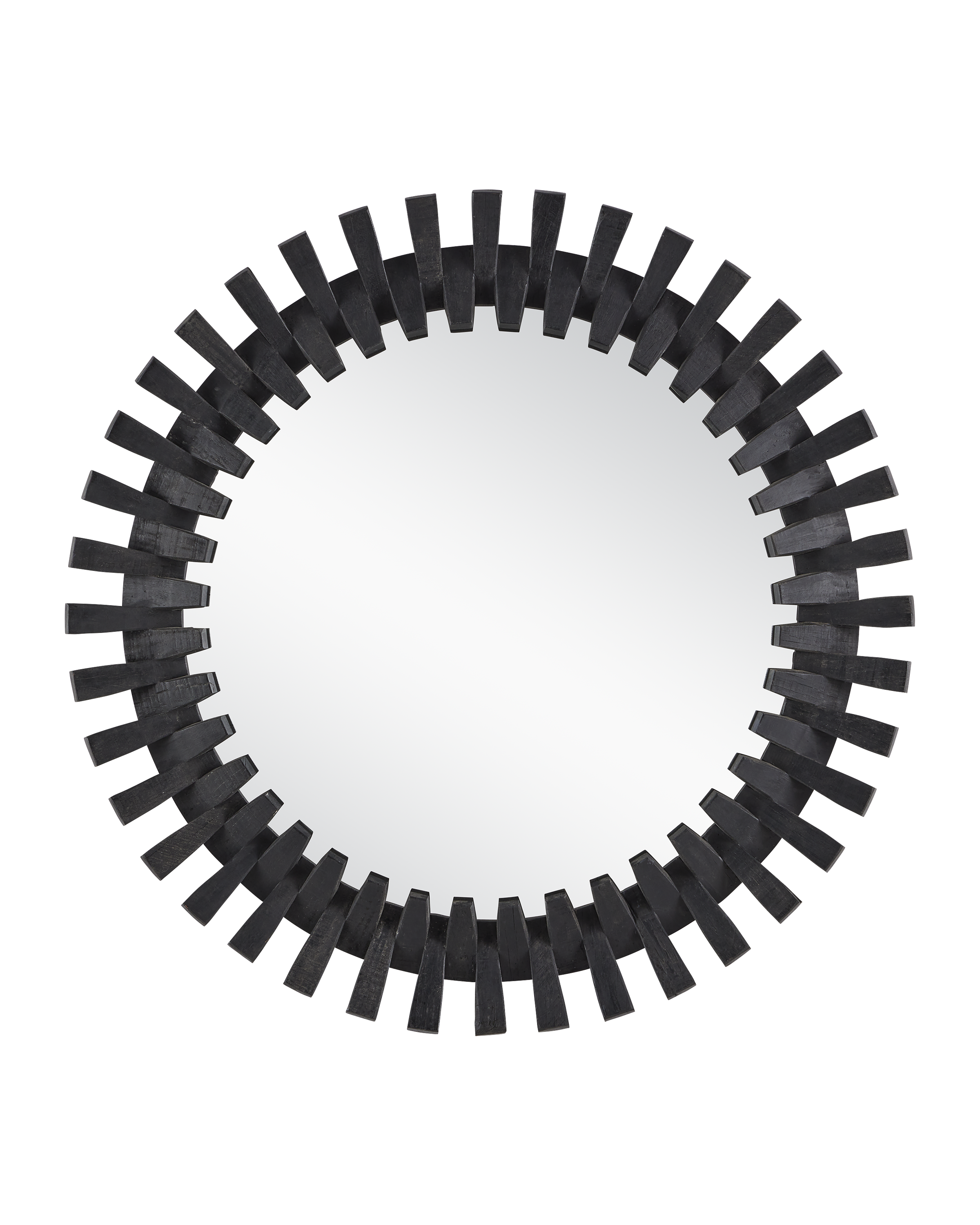 The Diza Round Black Mirror has a profile that is just as interesting from the side as it is from the front. This is because the wood pieces, which taper and are fitted in by hand, splay outward on both the exterior and the interior of the black mirror. The depth this creates will make the decorative mirror a commanding element in a space. Both the very subtle crackle effect created by the woodgrain and the shape are textural details.