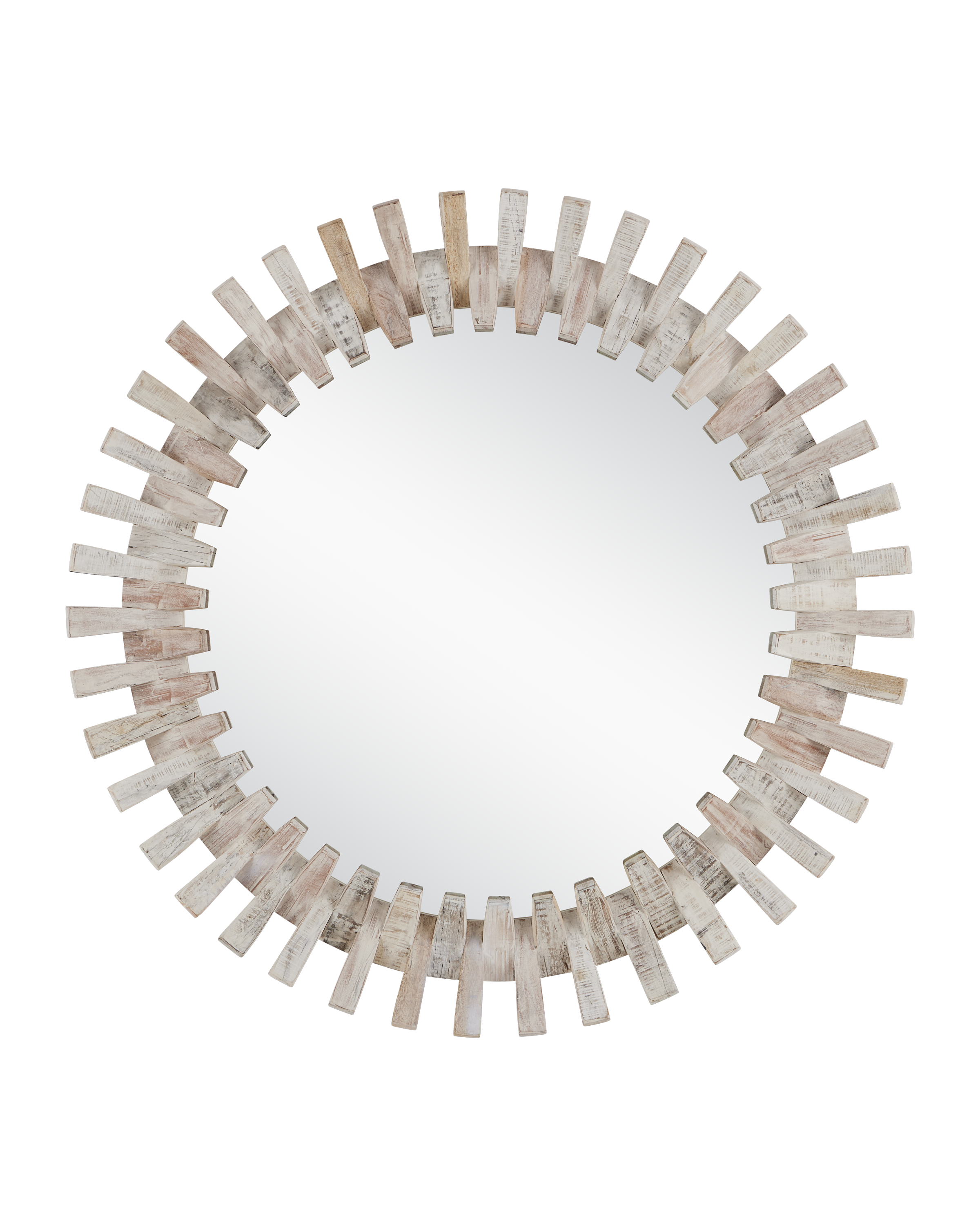 The Diza Round Whitewash Mirror has a profile that is just as interesting from the side as it is from the front. This is because the wood pieces, which taper and are fitted in by hand, splay outward on both the exterior and the interior of the white mirror. The depth this creates will make the decorative mirror a commanding element in a space. Both the woodgrain that shows through in spots and the shape are textural details.