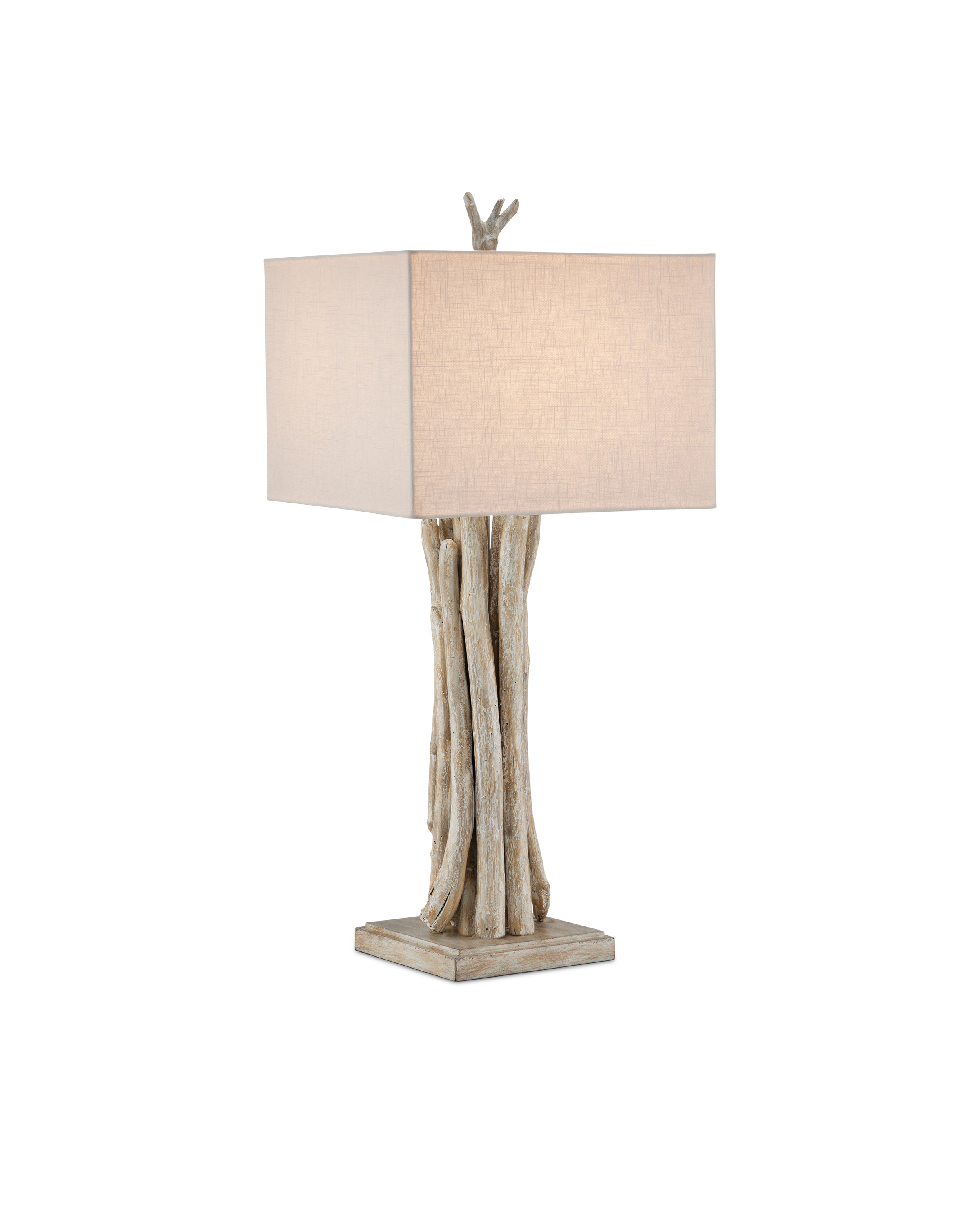 The Driftwood Whitewash Table Lamp is made of flowing driftwood sticks that rise from a square wood base, all in a washed driftwood finish. The forked finial on the composition is also in this finish, the disparate elements rubbed by hand to create uniformity while still maintaining hints of patina. The off-white linen shade is the perfect scale for this rustic creation, as it echoes the shape of the base.