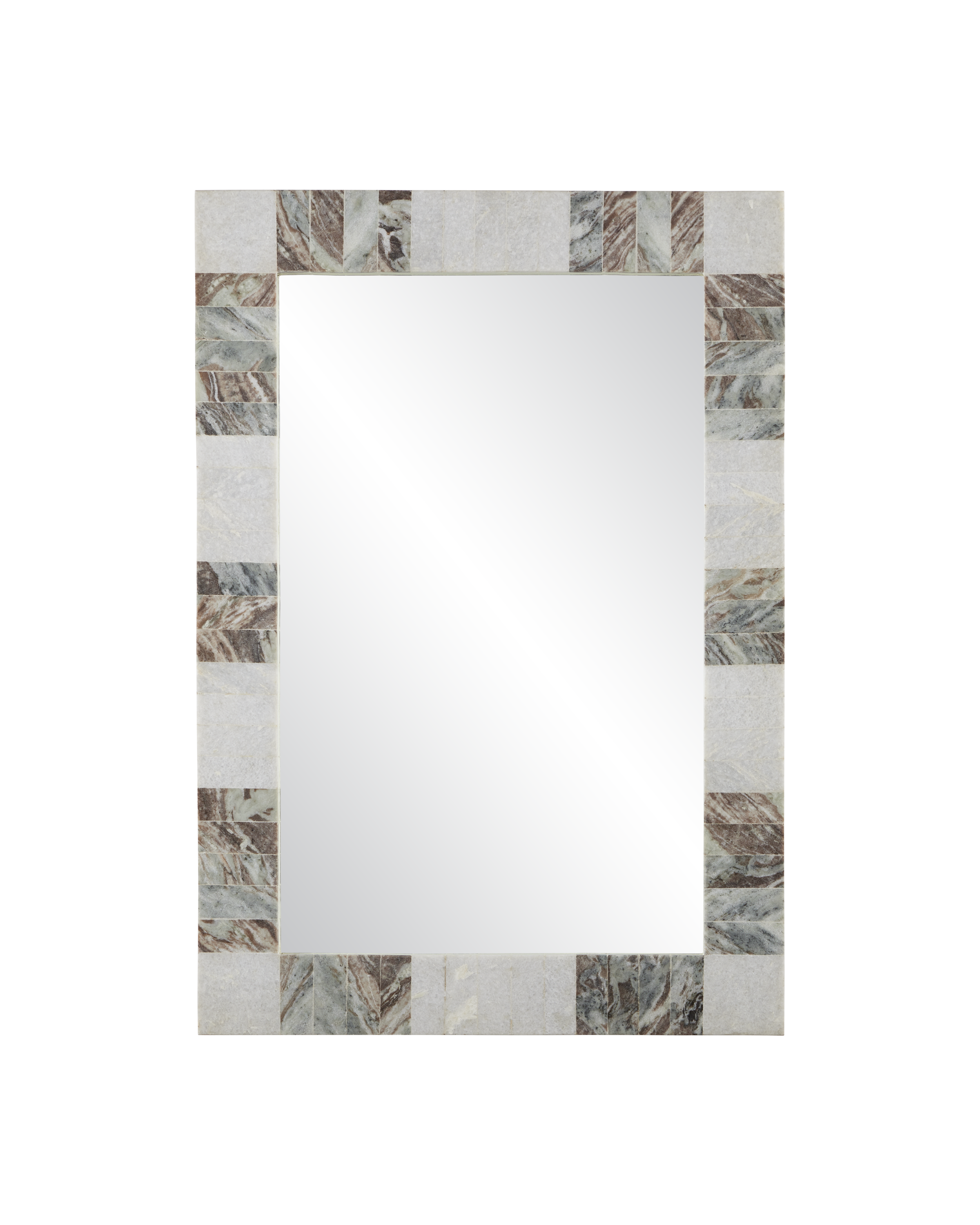 The Elena Rectangular Mirror is an artisanal offering made of intermingled pieces of Toronto and India white marble. The spacing of the darker Toronto marble brings the frame of the gray-brown and white decorative mirror balance and sophistication. There are two cleats on the back of the piece so that it can be hung either horizontally or vertically, each keeping the ornamental textural strips in the perfect position. A highly considered aspect of the design is how the corners have larger square blocks of marble.