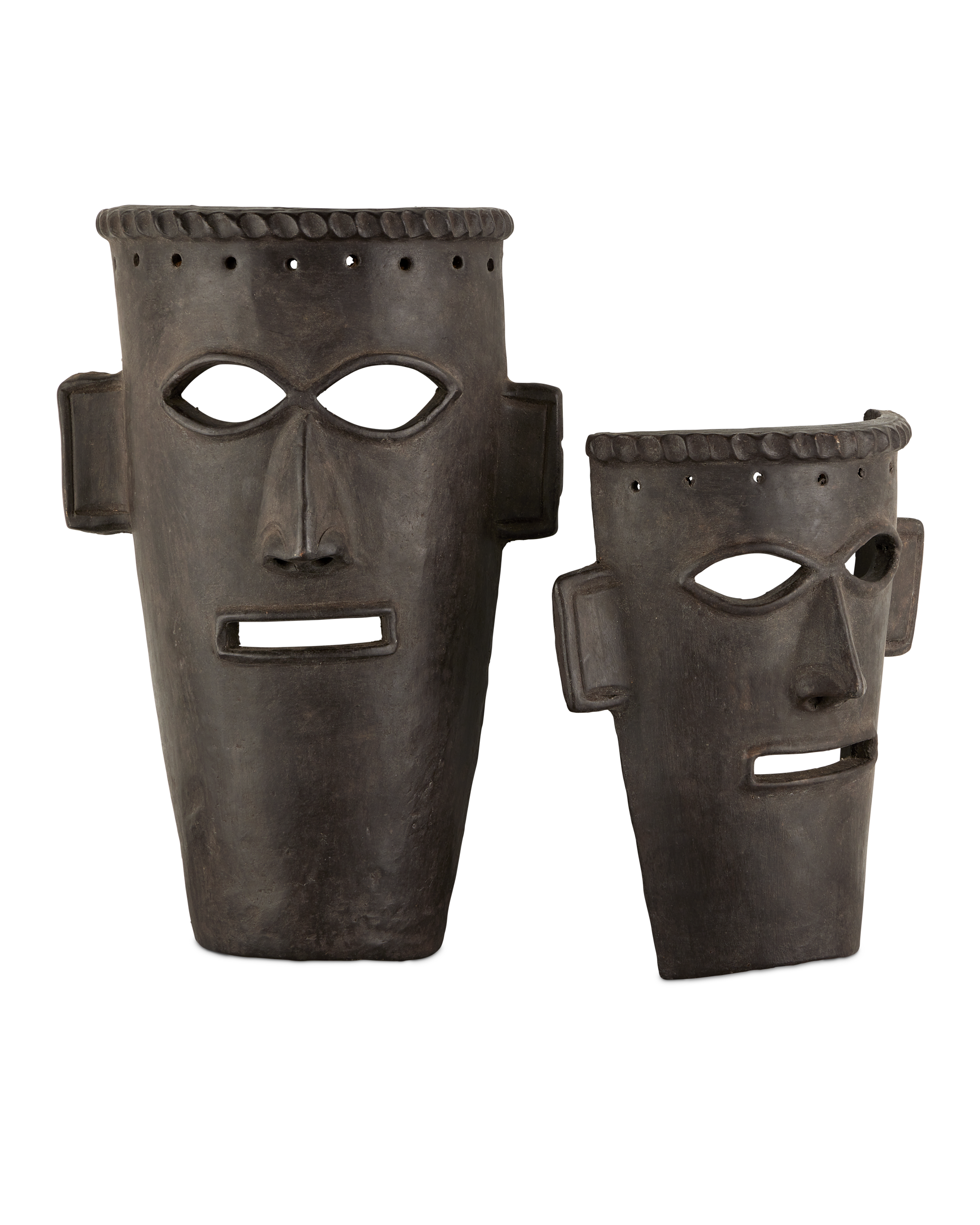 Made of clay, the Etu Black Mask Set includes two black masks that are medieval in their attitudes. The finish is rubbed onto the black sculptures so the clay shows through in spots to enhance the feel that these are aged artifacts. These are among our artisanal pieces that will be conversation starters in the spaces they will ornament.