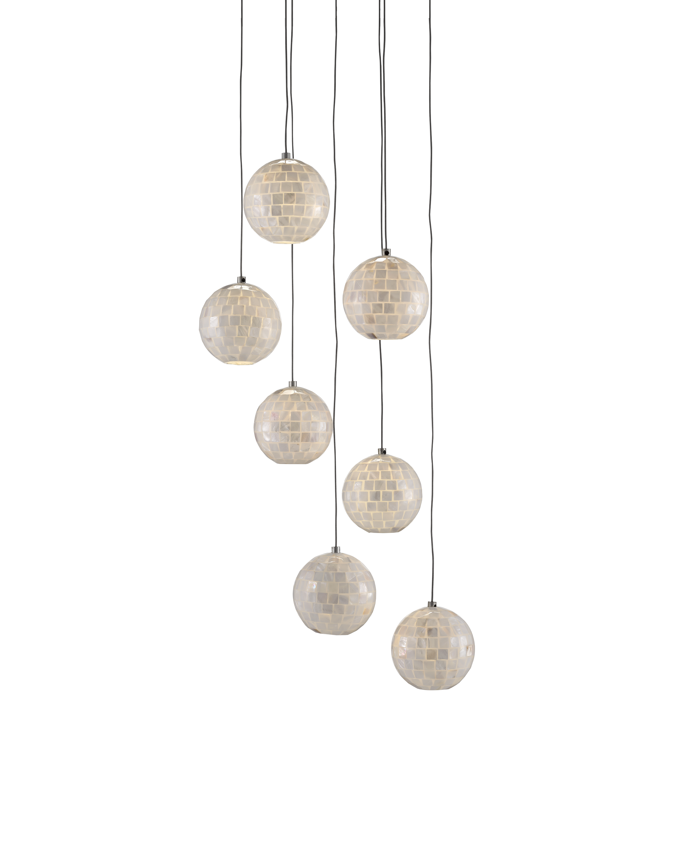 The Finhorn 7-Light Multi-Drop Pendant has orb-shaped shades covered with small squares of mother of pearl, painstakingly hand-applied. The canopy of this piece is luminous in a painted silver finish. This fixture is among Currey & Company's multi-drop pendant collection, which includes multiple configurations.