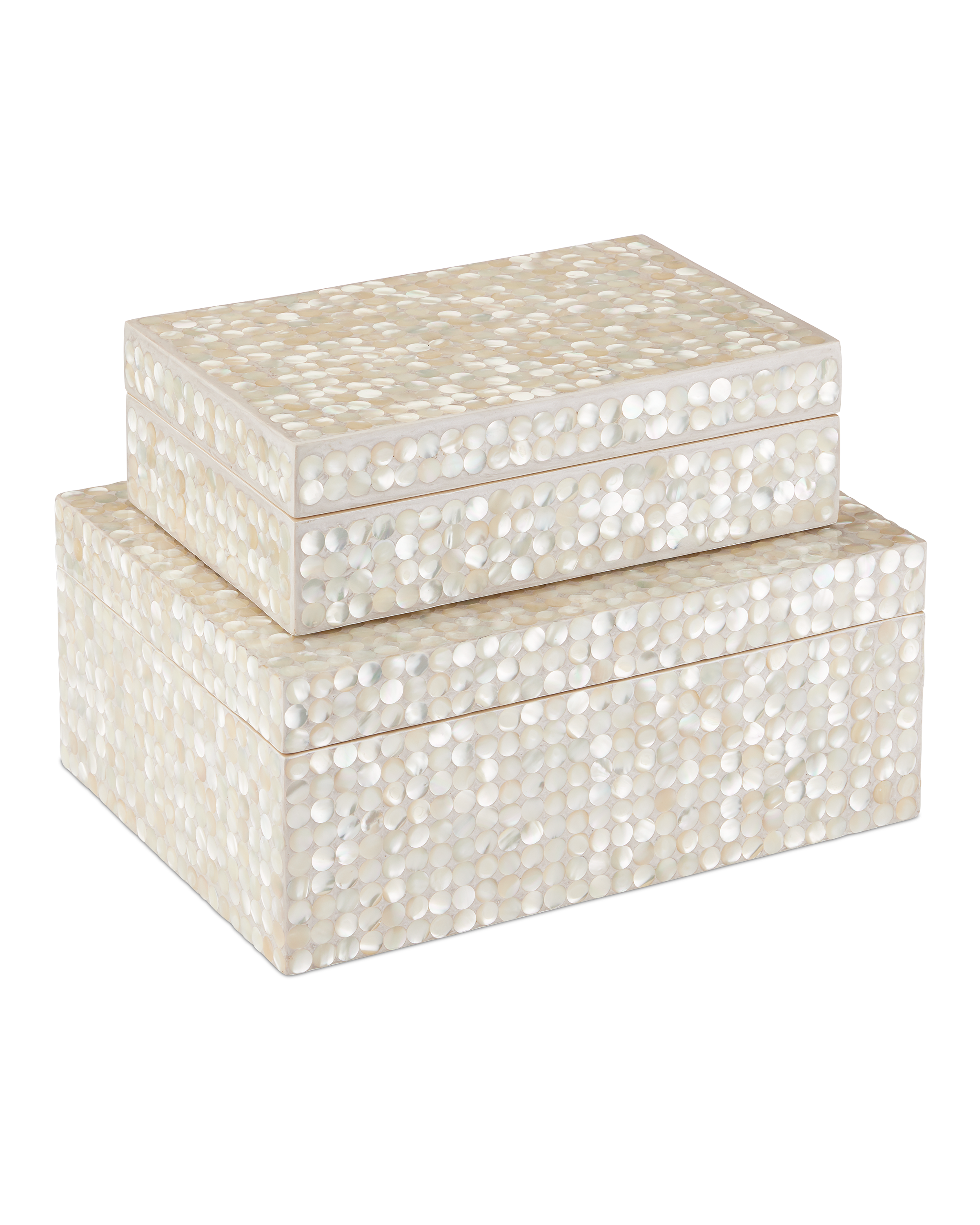 A shimmering duo of compositions, the Gerri Dot Box Set includes two white decorative boxes covered in tiny circlets of mother of pearl. The process of placing the material so uniformly on the sides and the top of these boxes is a painstaking process that takes hours to complete. The circlets are held in place by the composite into which they are set. The intermingling of crisp white and pale ivory pieces of shell brings these boxes added texture.