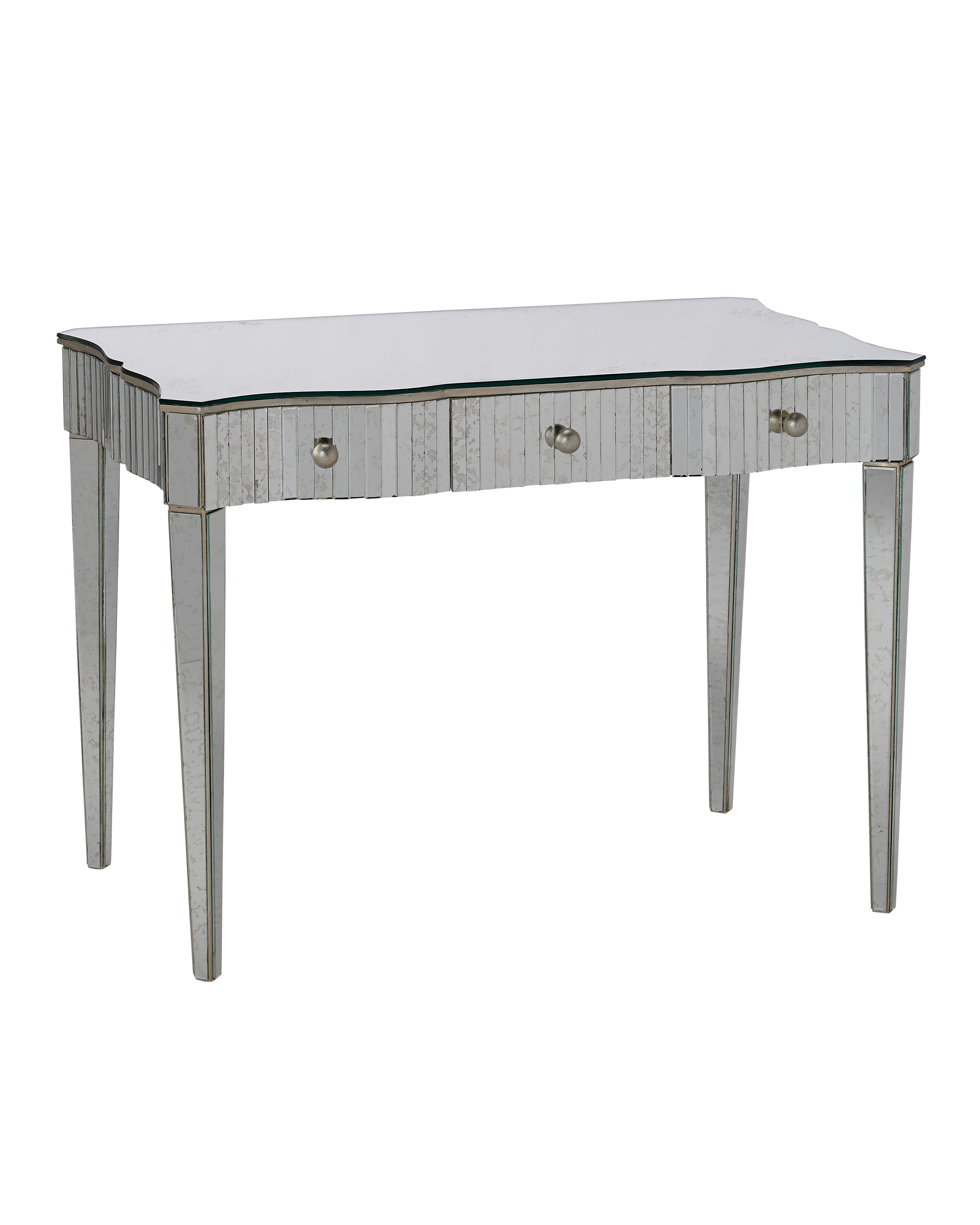 The Gilda Silver Vanity Table is Hollywood glamour personified with its panes of mottled mirror applied to a wrought iron base. The fluted shape of the edges on its top is a distinctive feature. Pair it with the Gilda Vanity Mirror to add to its air of sophistication.