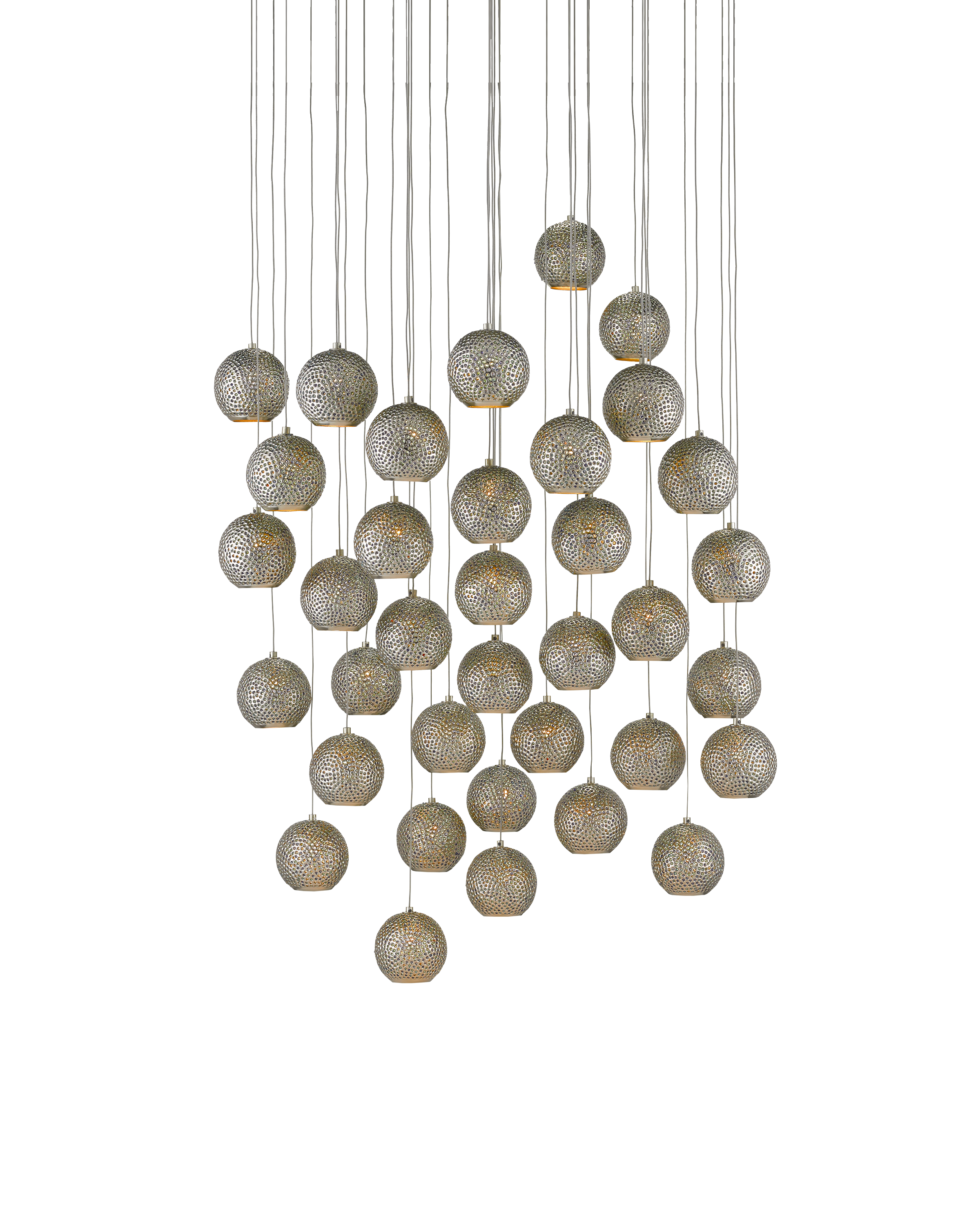 Our Giro 36-Light Multi-Drop Pendant has metal shades that are pierced by hand, the textural globes in a mix of painted silver and nickel finishes on point for modern farmhouse interiors. Small blue beads placed in some of the piercings add a lovely color to the silver pendant as light strikes them. The canopy of this piece is luminous in a painted silver finish. This fixture is among Currey & Company's multi-drop pendant collection, which includes multiple configurations.