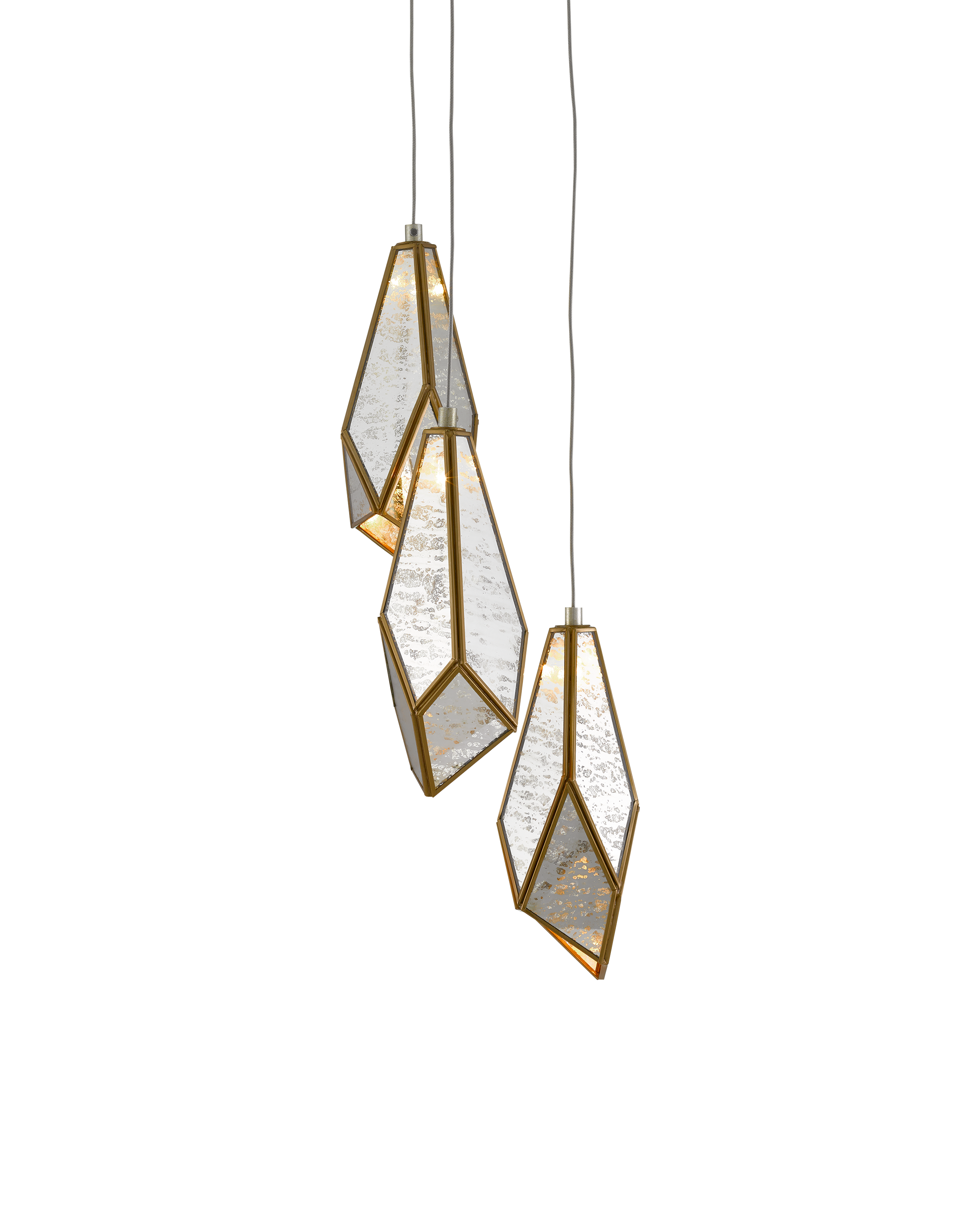 The faceted shades of the Glace 3-Light Multi-Drop Pendant are made of panes of Raj mirror joined with seams of metal in a brass finish. The organic shape of the shades and the fact they hang at differing heights brings this mirrored pendant added personality that will make it a piece of jewelry in a space. The canopy of this piece is luminous in a painted silver finish. This fixture is among Currey & Company's multi-drop pendant collection, which includes multiple configurations.