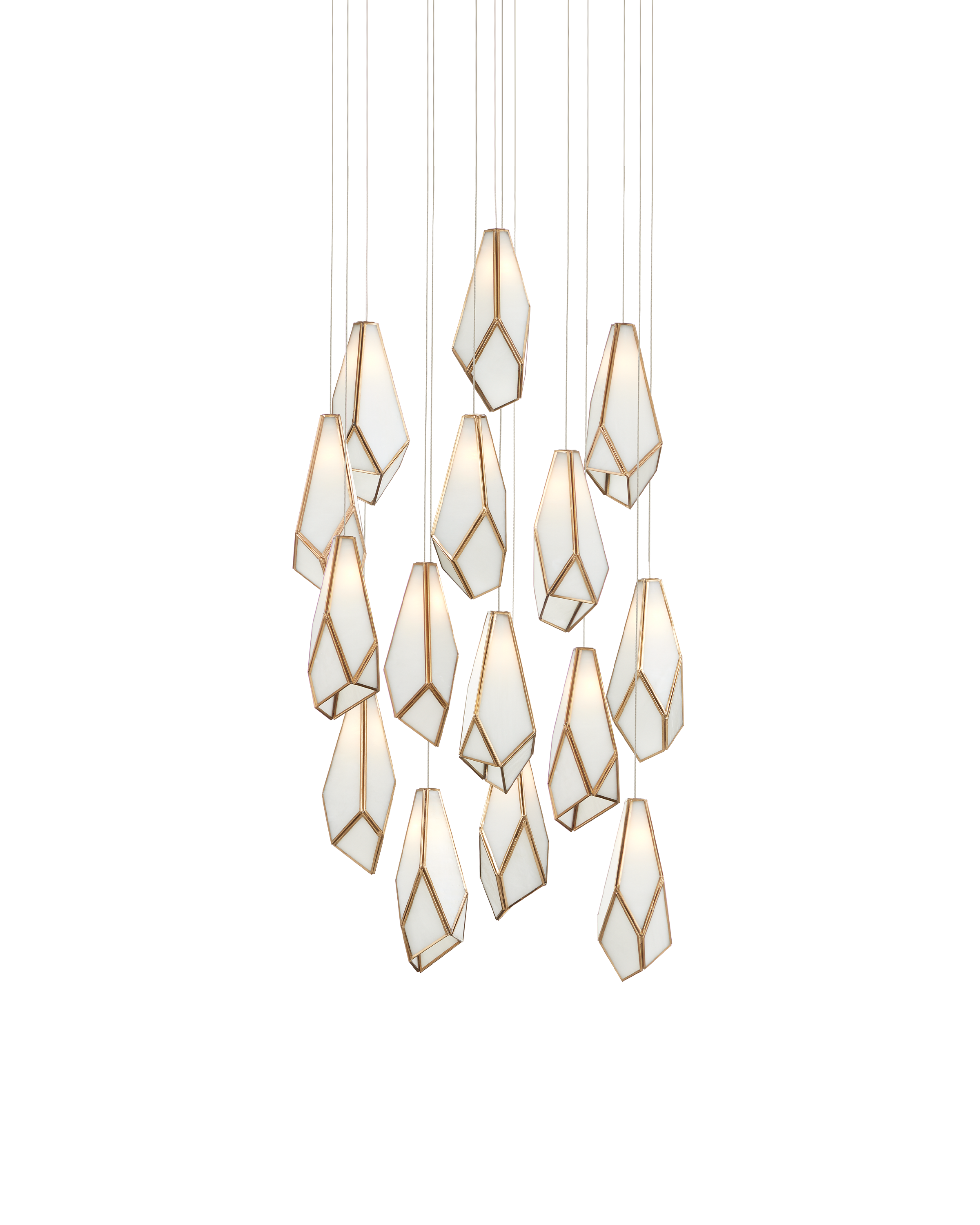 The faceted shades of the Glace White Round 15-Light Multi-Drop Pendant are made of panes of white art glass joined with seams of metal in an antique brass finish. The organic shape of the shades and the fact they hang at differing heights enhance the personality of this white pendant, which will ornament a space like a piece of jewelry. Art glass is one of the most artisanal materials that can be used, as its swirling opaque surface creates a milky glow whether lights are switched on or not. The canopy of this piece is luminous in a painted silver finish. This fixture is among Currey & Company's multi-drop pendant collection, which includes multiple configurations.