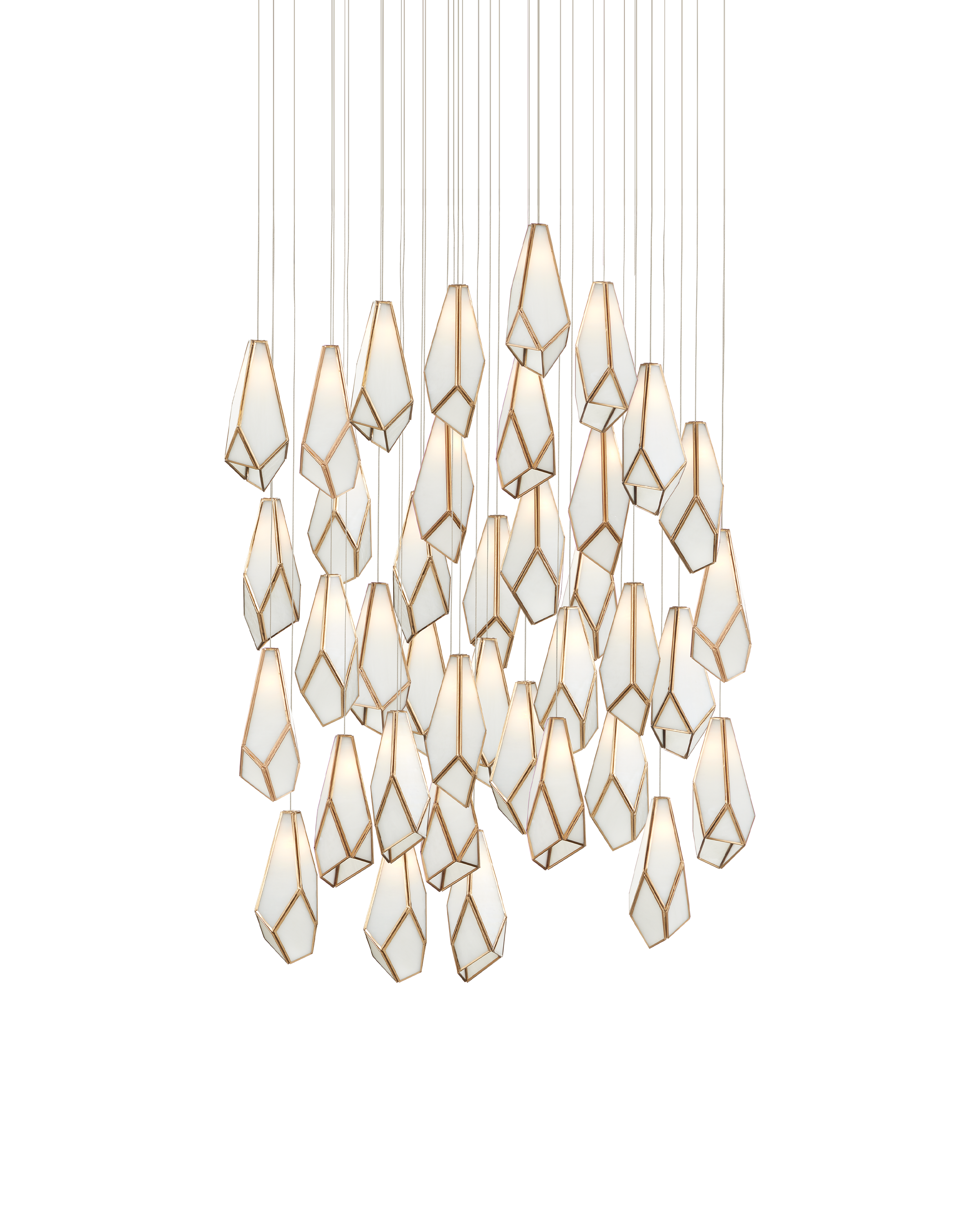 The faceted shades of the Glace White 36-Light Multi-Drop Pendant are made of panes of white art glass joined with seams of metal in an antique brass finish. The organic shape of the shades and the fact they hang at differing heights enhance the personality of this white pendant, which will ornament a space like a piece of jewelry. Art glass is one of the most artisanal materials that can be used, as its swirling opaque surface creates a milky glow whether lights are switched on or not. The canopy of this piece is luminous in a painted silver finish. This fixture is among Currey & Company's multi-drop pendant collection, which includes multiple configurations.