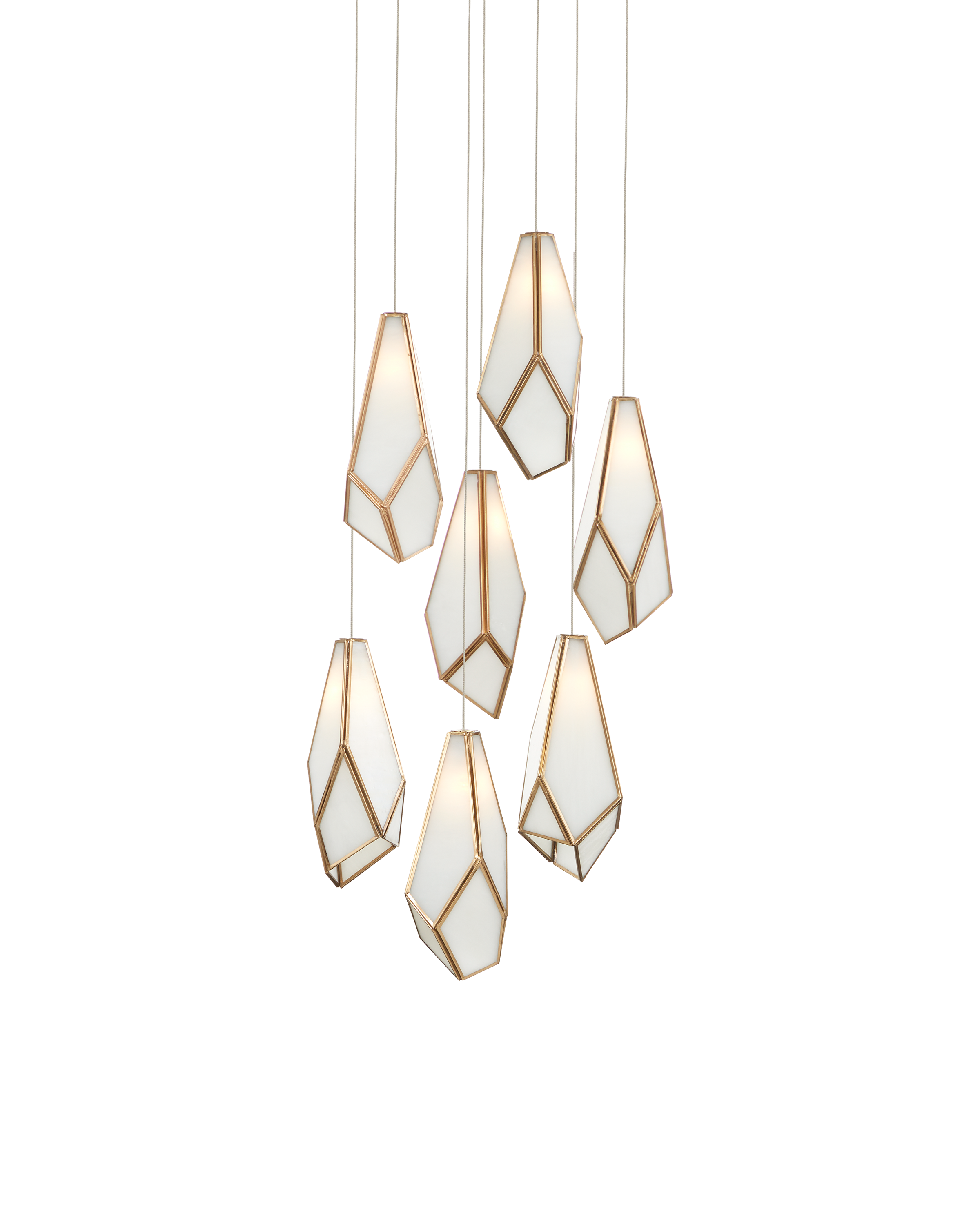The faceted shades of the Glace White Round 7-Light Multi-Drop Pendant are made of panes of white art glass joined with seams of metal in an antique brass finish. The organic shape of the shades and the fact they hang at differing heights enhance the personality of this white pendant, which will ornament a space like a piece of jewelry. Art glass is one of the most artisanal materials that can be used, as its swirling opaque surface creates a milky glow whether lights are switched on or not. The canopy of this piece is luminous in a painted silver finish. This fixture is among Currey & Company's multi-drop pendant collection, which includes multiple configurations.