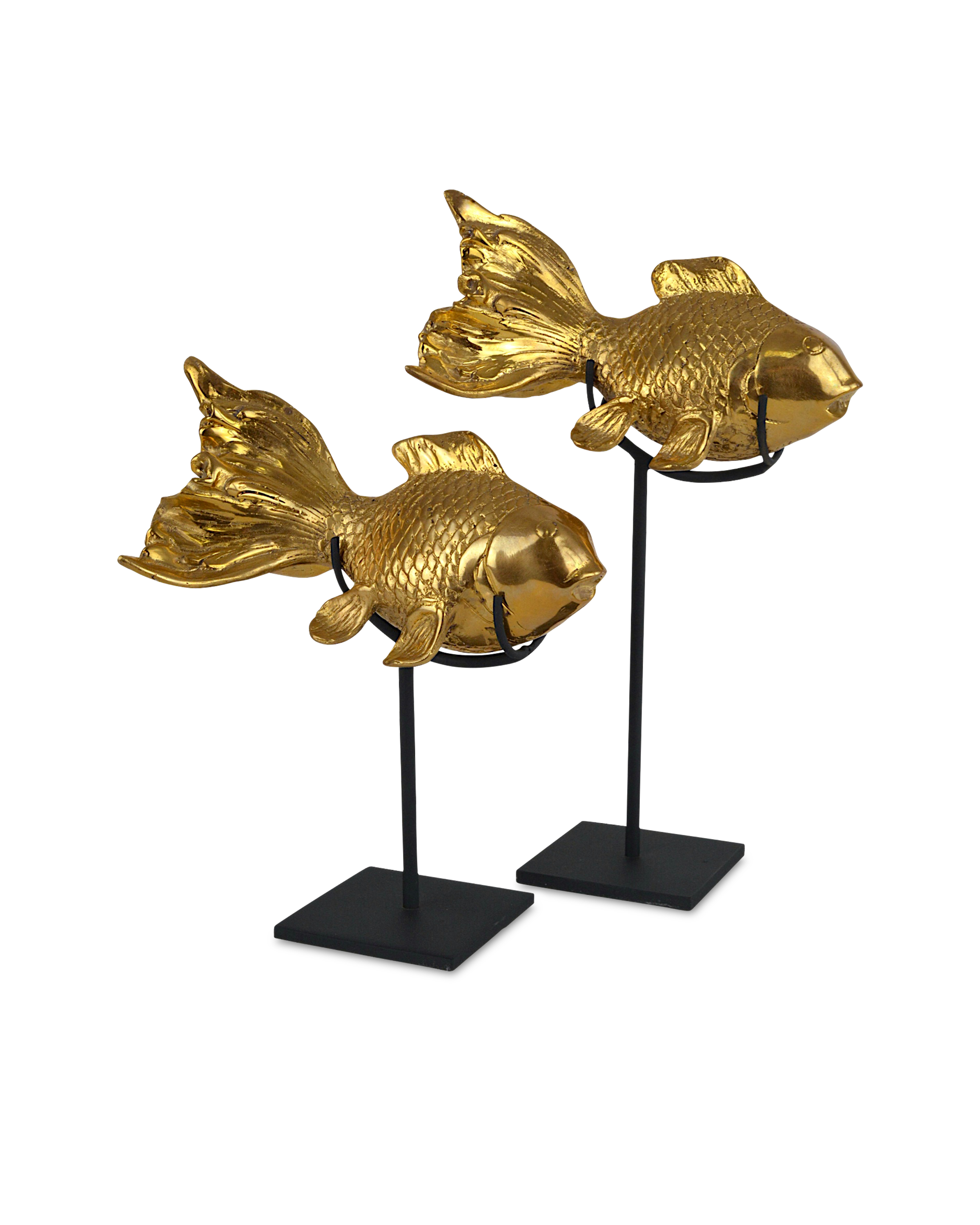 The Goldfish Set of sculptures is a pair of sturdy decorative accessories that can be placed on a table or on their included stands. Made of bronze in a gold polish finish, the fish, symbols of wealth and good fortune in some cultures, have a beautiful fluidity just as they would if they were real and swimming through water.