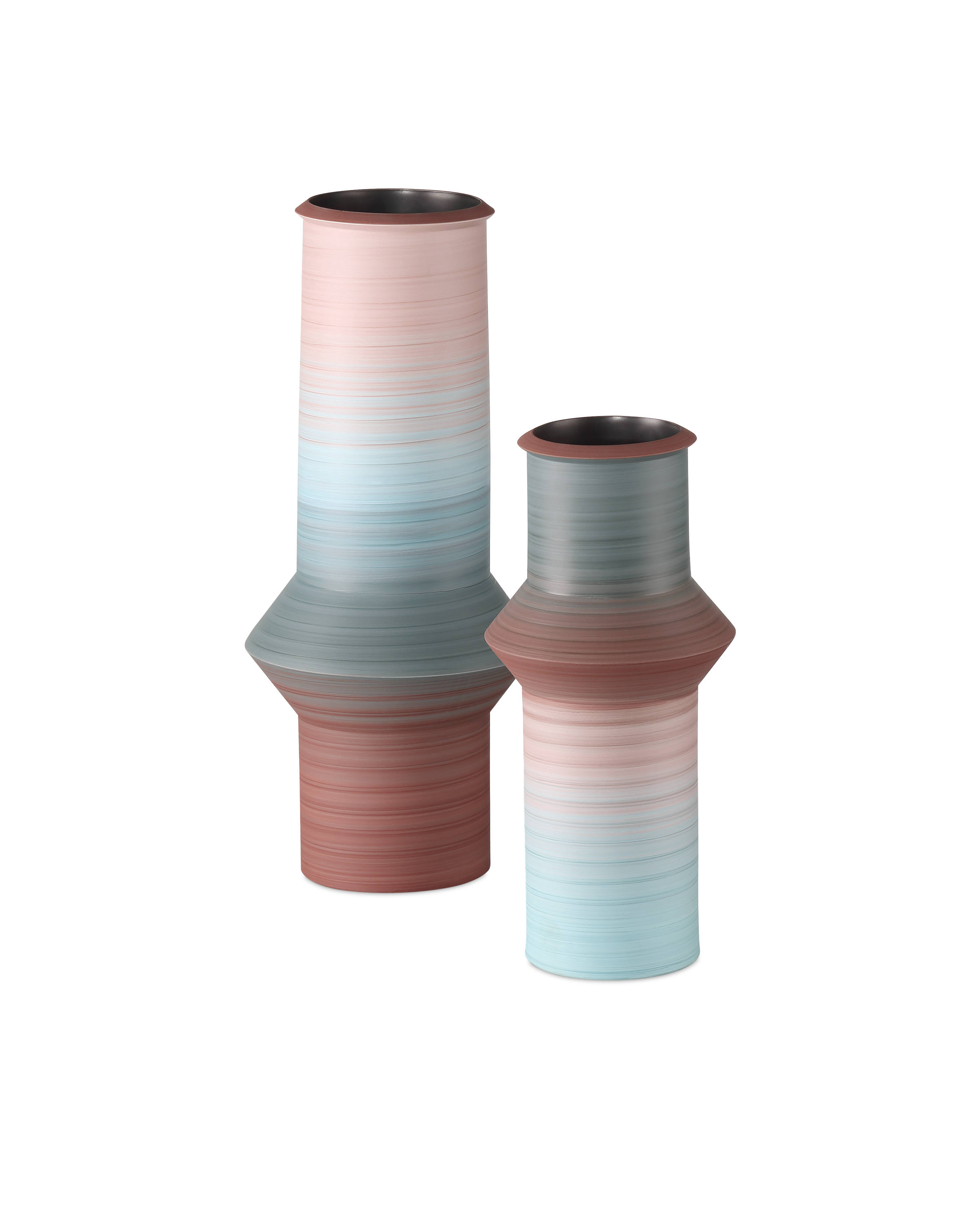 The Happy 80s Blue & Red Vase Set is a throwback to the decade when bold, vibrant, and eclectic ruled the stylistic spectrum, from interior design to fashion. Made of porcelain, the glazes on the exteriors of these vessels will vary because they are applied while the vases are spinning. This brings the two works of art a textural feel. The insides of the vases are covered in a black glaze, and the nicely fashioned lip surrounding their top-most points echoes the shapes of the bulges below them.