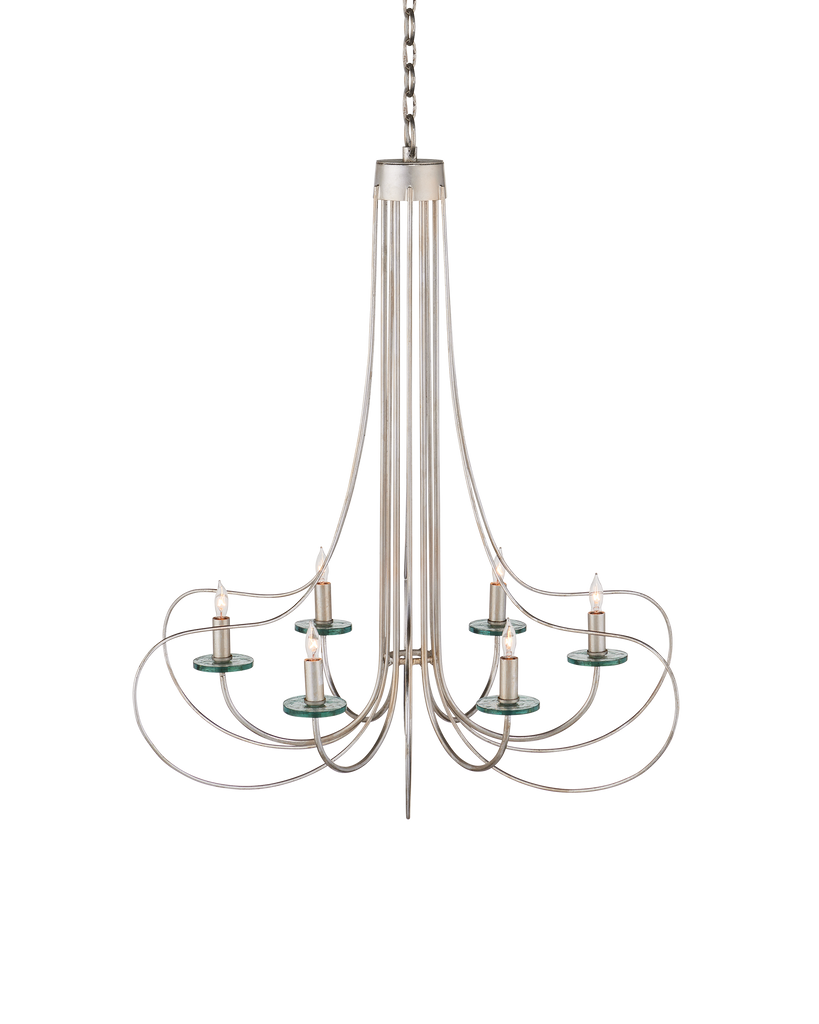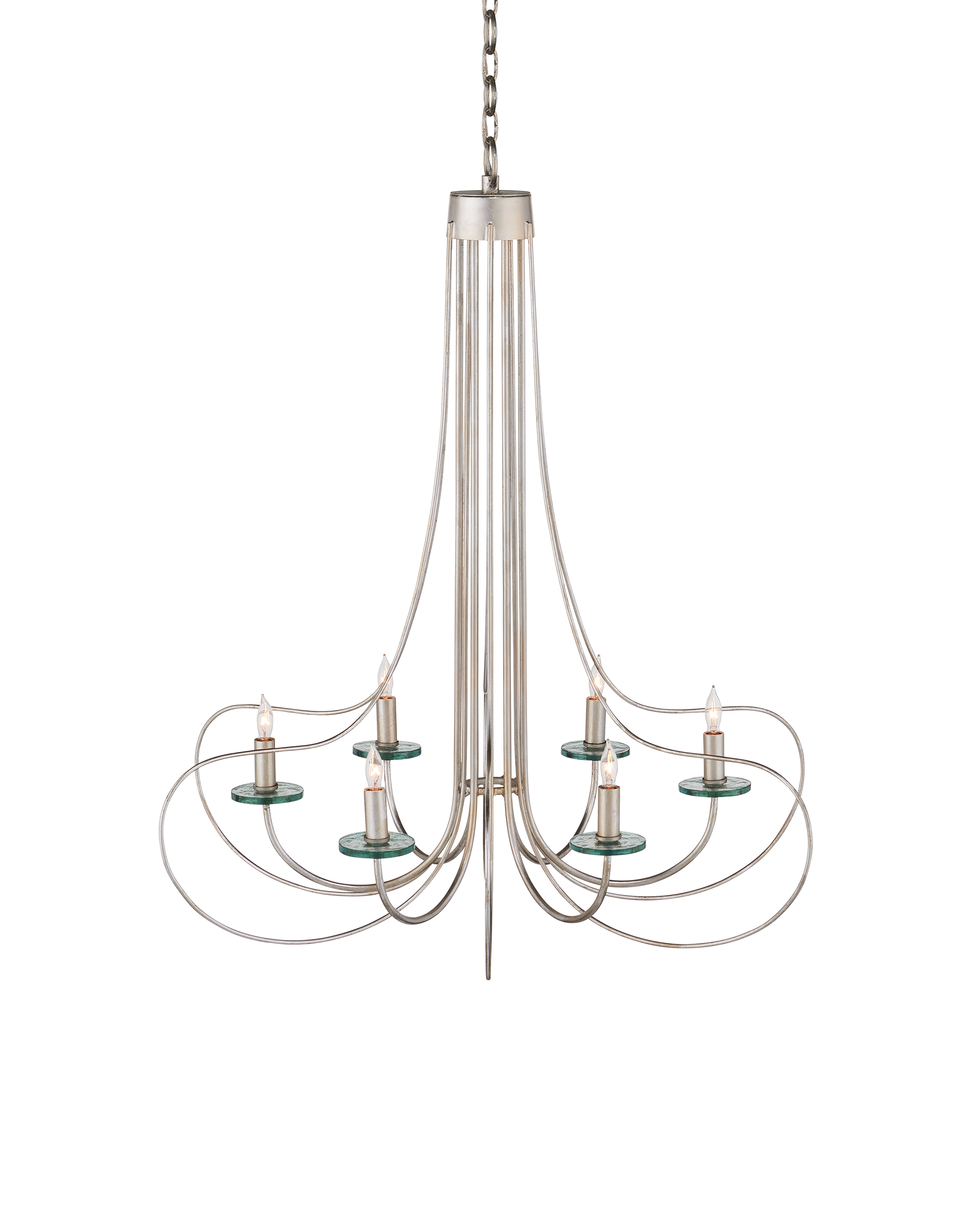 The Harrow Chandelier is made of wrought iron ribs that gracefully arc around to create sophisticated loops with a slight Deco feel. The mix of contemporary silver leaf and contemporary silver finishes, combined with the recycled glass discs that serve as bobeches, make this a modern fixture with great flair. The way the recycled glass catches the light increases the sheen of this silver chandelier, which showcases both repetition and symmetry. Adjustable from 40.75" to 108.75" with use of included chain/rod kit/cable. If your space calls for a longer drop, additional chain/rods/cable is available for purchase.