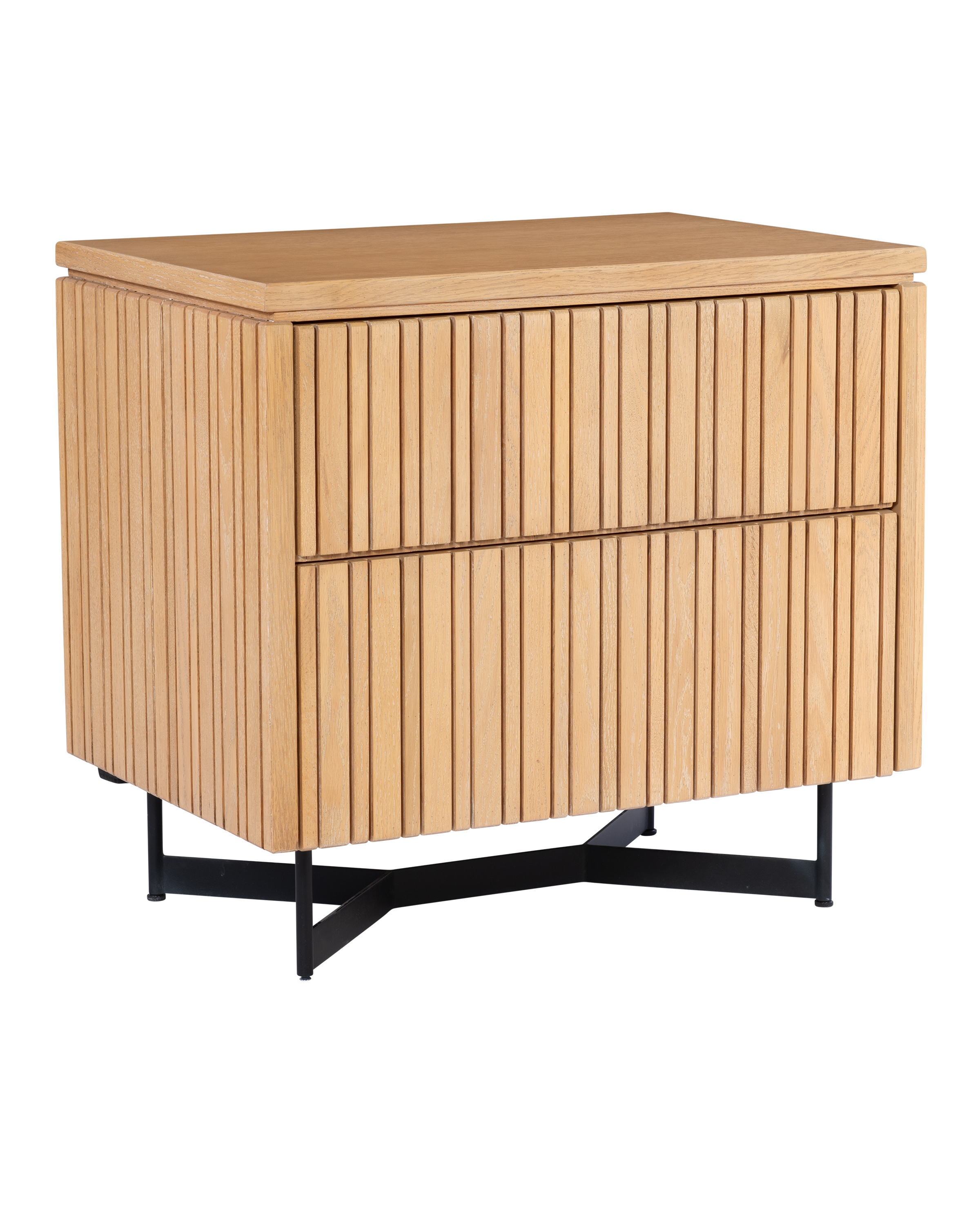 The Indeo Washed Oak Nightstand is an intricate piece of furniture. Made of two sizes of solid oak slats that are clad in oak veneers and inset into the frame, the piece is covered in a washed oak finish. The two-drawer nightstand sits cleverly on iron legs with generously sized stretchers in a black finish. The drawers are push-to-open.