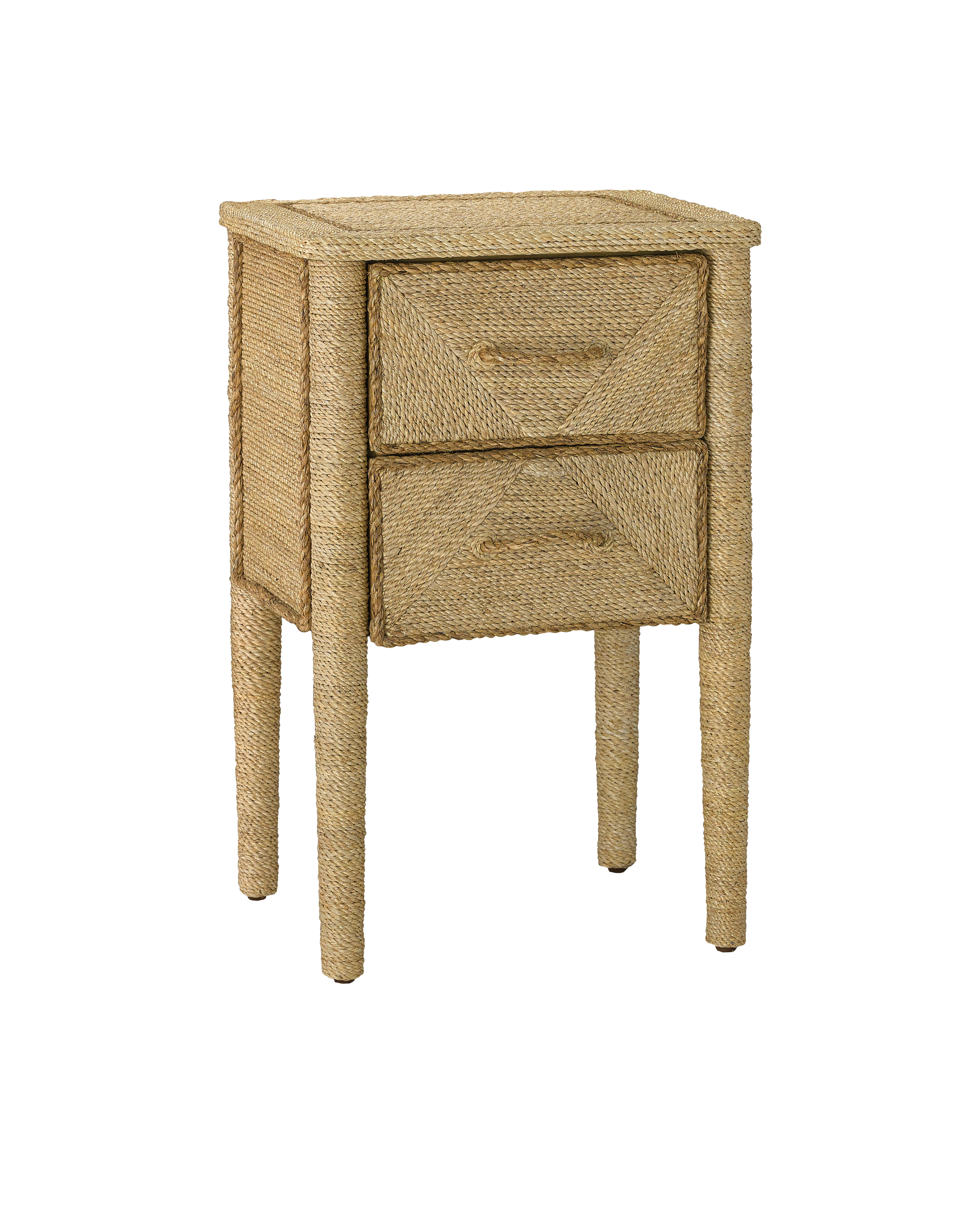 The Kaipo Rope Nightstand is wrapped artistry with its exterior and drawer-fronts covered painstakingly in Abaca rope. The heftier rope drawer-pulls give this piece a nautical feel. The rope nightstand is one of our artisanal pieces that requires great skill to create, as the sisal is painstakingly hand-applied to each piece.