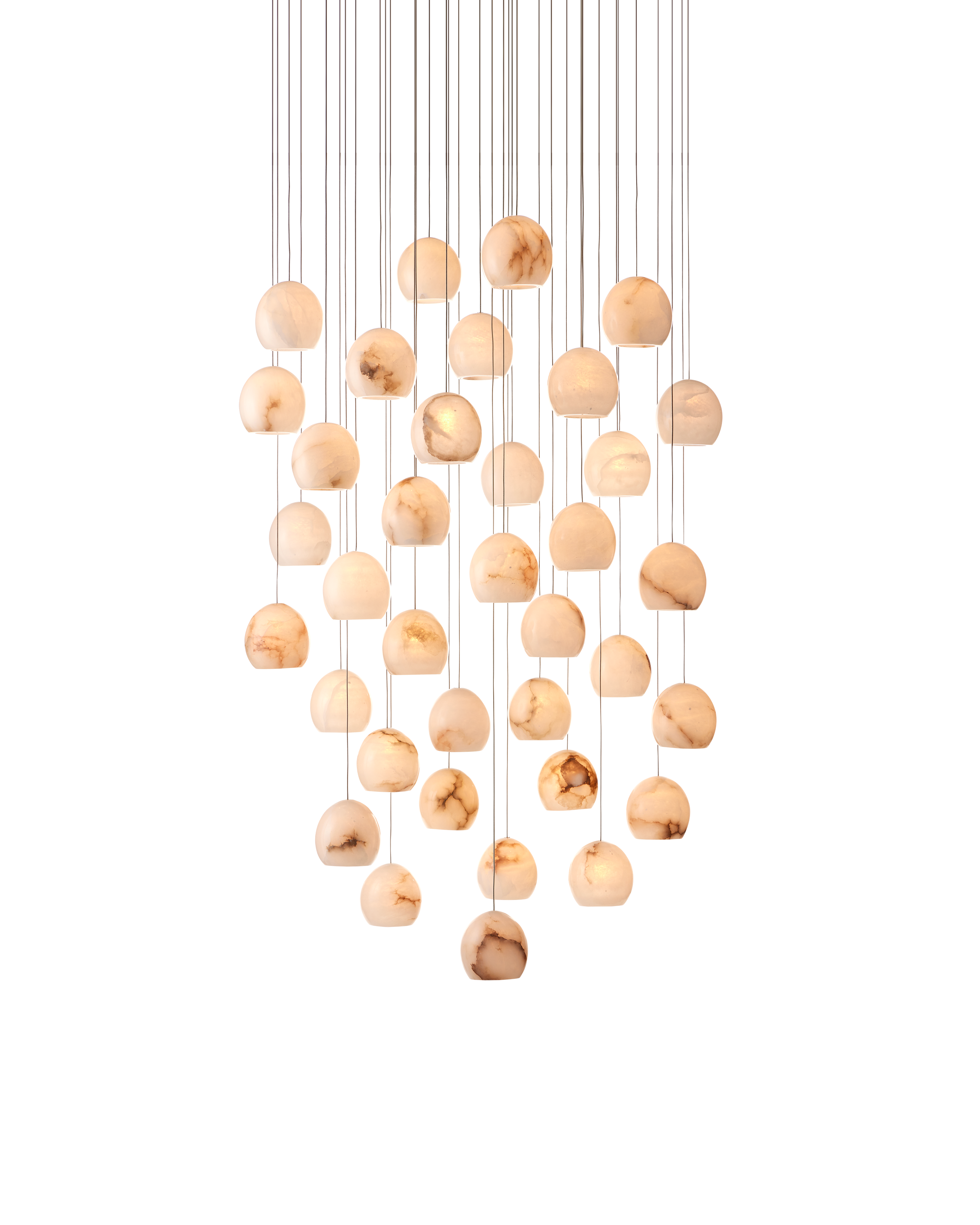 The Lazio 36-Light Multi-Drop Pendant has luminous shades carved from natural alabaster. The veining in the material makes each shade unique because each stone taken from the earth will have its own personality. The canopy of this piece is luminous in a painted silver finish. This fixture is among Currey & Company's multi-drop pendant collection, which includes multiple configurations.