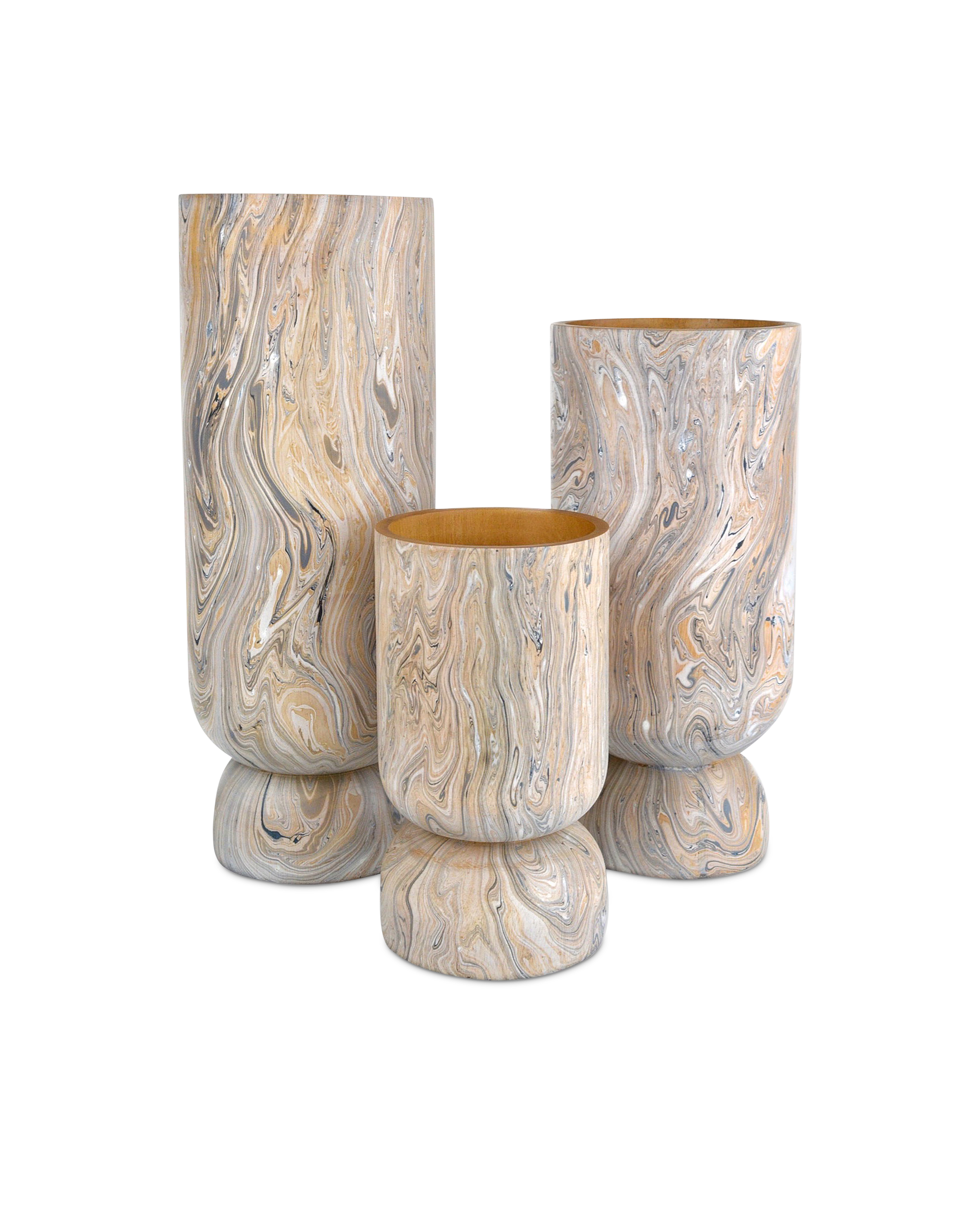 Made of wood, the London Sky Vase Set includes three gray and peach vases with swirling patterns along their surfaces, which have been hand-painted for a marbleized effect. The neutral tones of tan, peach, white, and gray bring these tan decorative accessories a textural feel. The patterning on these multicolored vases will make them dynamic elements in a room.