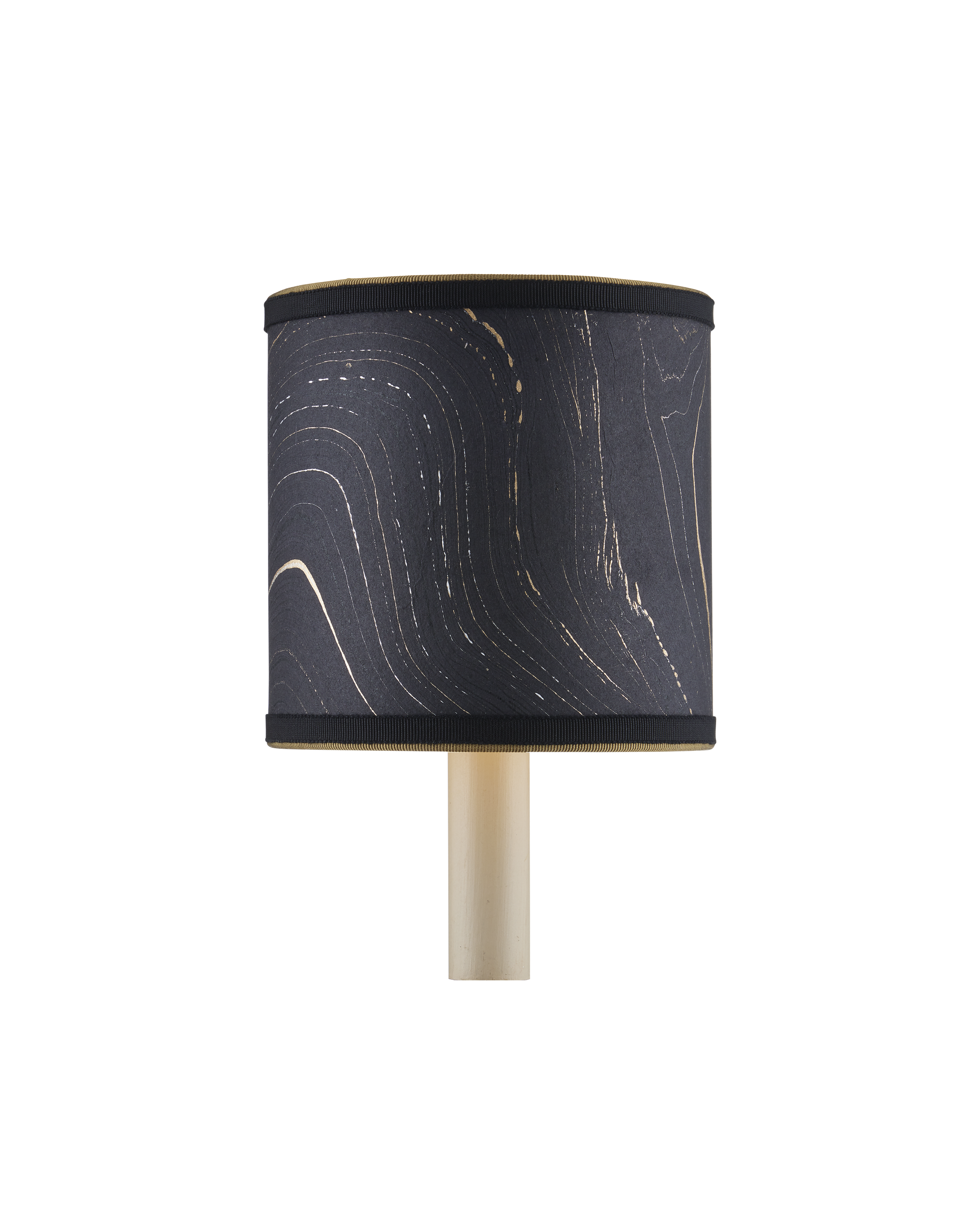 Petite shades are an easy way to bring added style to a space while also introducing color and texture, particularly when they are made from artisanal marbleized paper and ornamented with two layers of grosgrain ribbon in different hues. The saturation of the colors on the handmade tapered and cylindrical shades for chandeliers and wall sconces is achieved by a New England atelier. Patterns will vary because they are created during a very organic process that makes any surface treated to marbleizing so special. There are both vivid and pastel patterns in this collection, as you can see from this black, gold, and silver version of the drum shade. Top Diameter: 5" Bottom Diameter: 5" Height: 5"