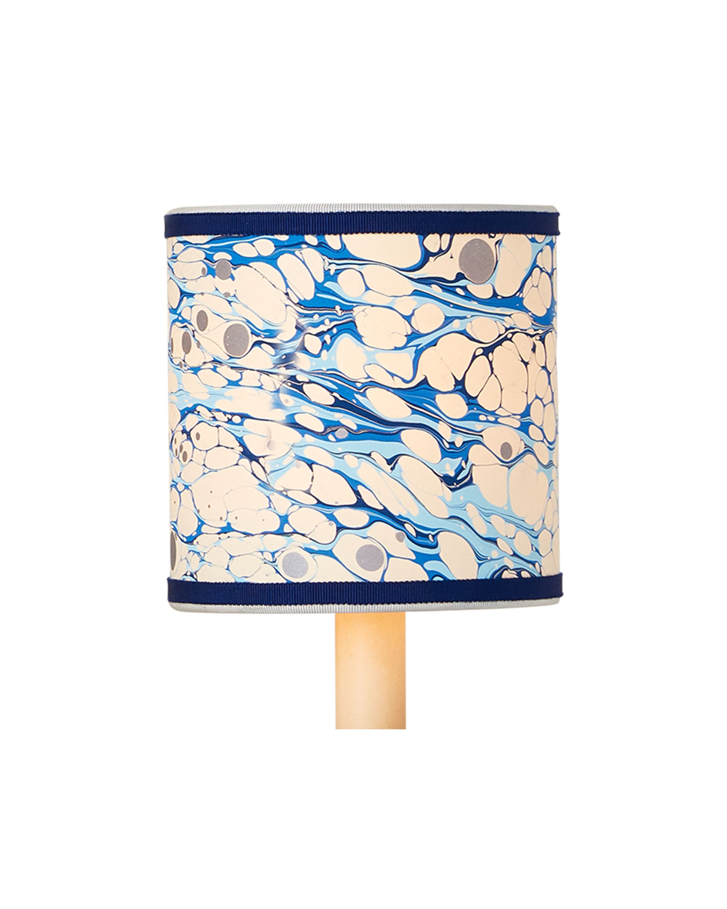 Petite shades are an easy way to bring added style to a space while also introducing color and texture, particularly when they are made from artisanal marbleized paper and ornamented with two layers of grosgrain ribbon. The Marble Blue Lace Paper Drum Chandelier Shade has a lace pattern in blues that was achieved by a New England atelier. Patterns will vary slightly due to the nature of the marbleizing process.