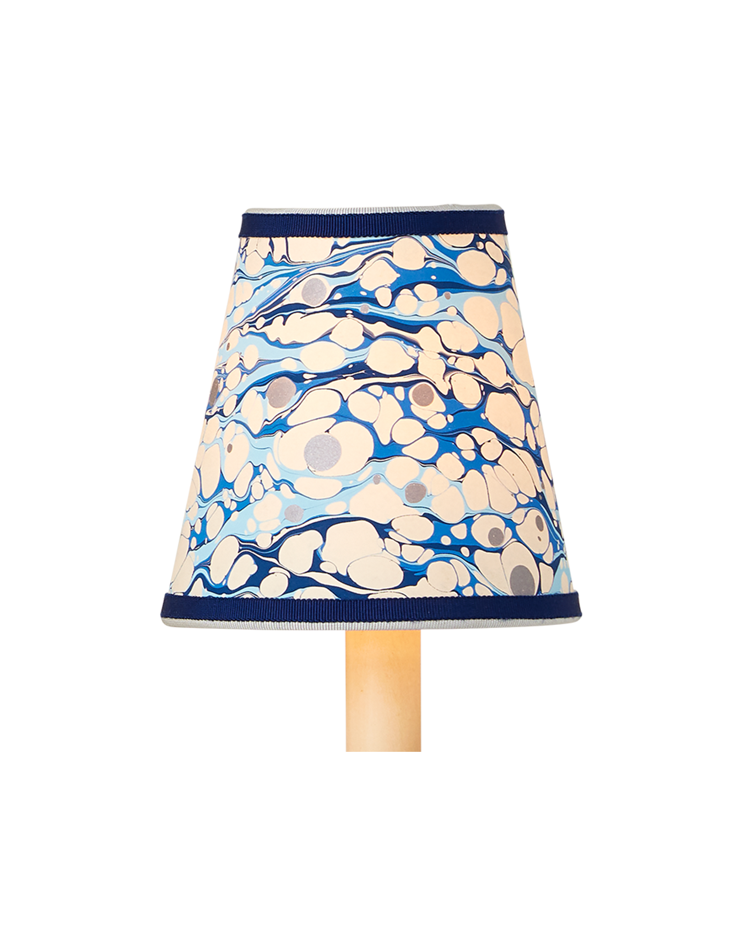 Petite shades are an easy way to bring added style to a space while also introducing color and texture, particularly when they are made from artisanal marbleized paper and ornamented with two layers of grosgrain ribbon. The Marble Blue Lace Paper Tapered Chandelier Shade has a lace pattern in blues that was achieved by a New England atelier. Patterns will vary slightly due to the nature of the marbleizing process.