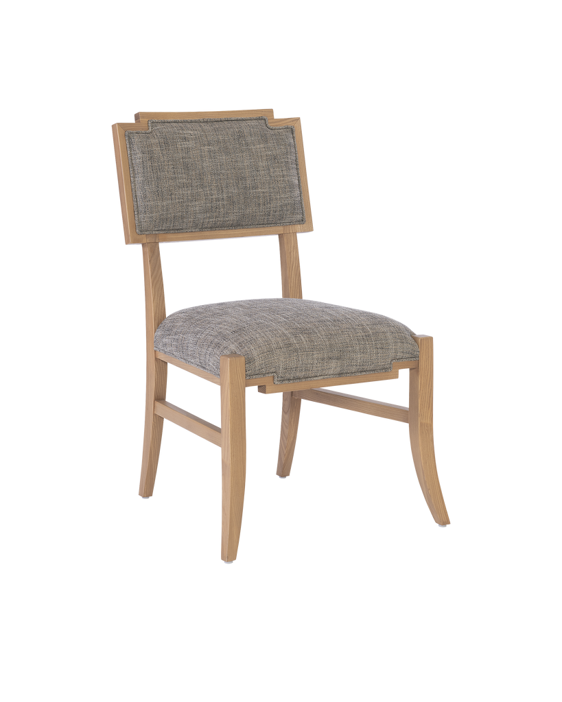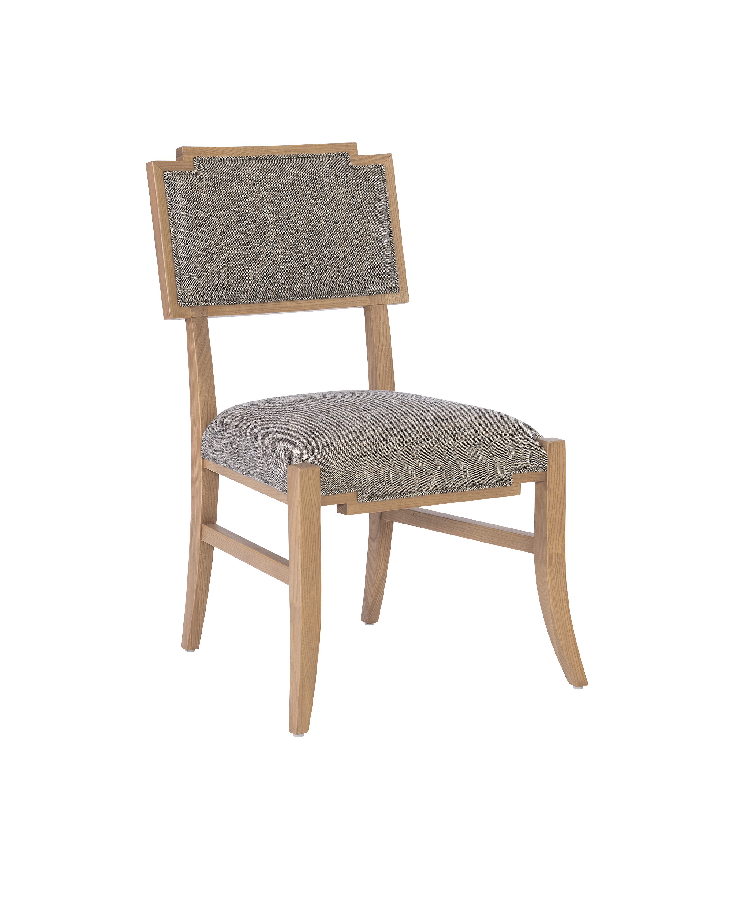 The Melanie Blonde Side Chair is made of ash wood in a blonde ash-wood finish; the slanting legs and the stepped details where the upholstery meets the wood on the seat are reminiscent of Greek stylistic leanings. These aspects of the side chair bring it added personality. The seat, and the front and back of the seatback are covered in a Liller Tortoise performance fabric that has a textural feel.
