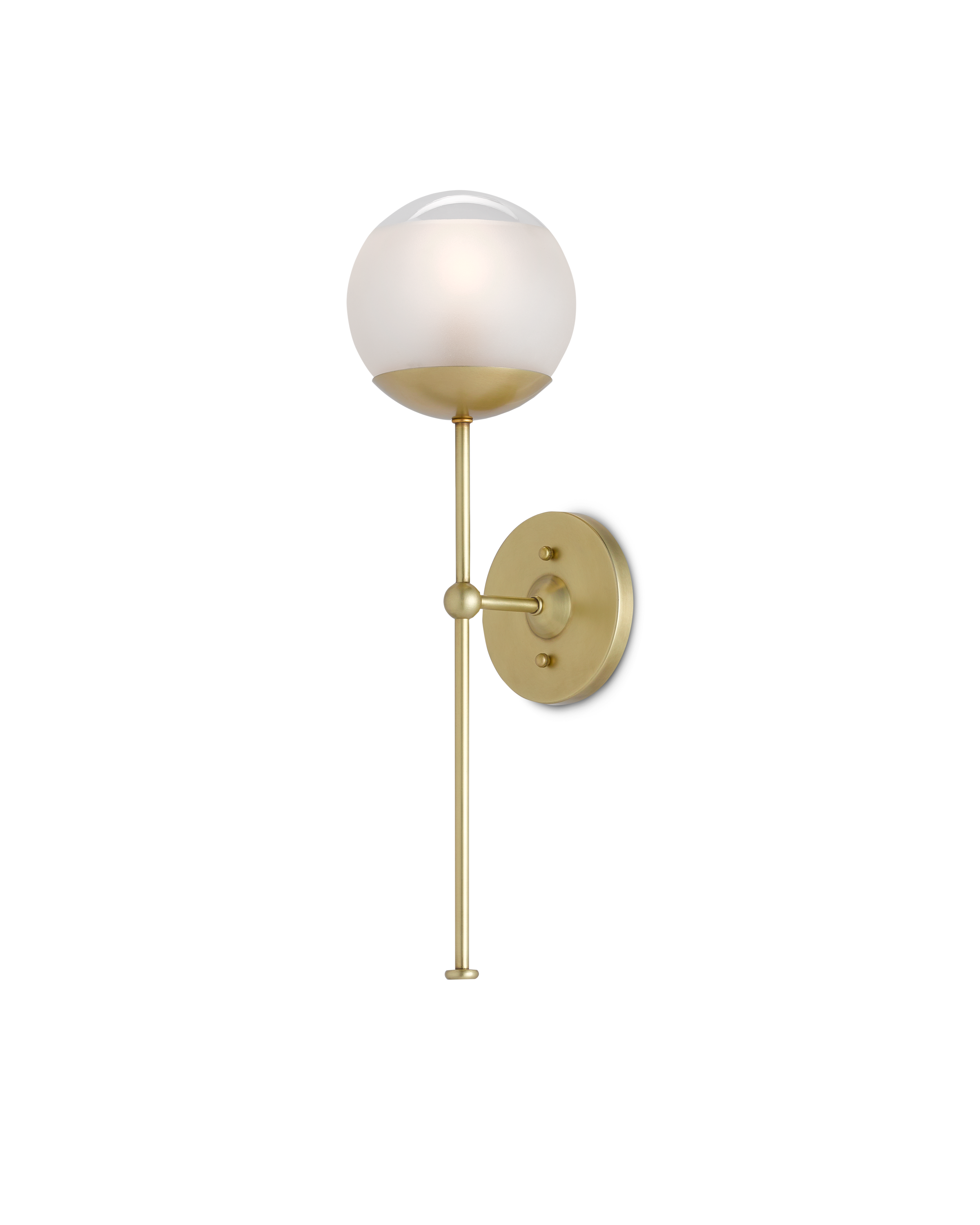 A special design attribute of the Montview Wall Sconce is its long stem holding its frosted glass globe in place. Made of metal in a brushed brass finish, the gold sconce reminds its designer, Clarence Mallari, of a planet in the solar system. The Montview is certified for damp locations.
