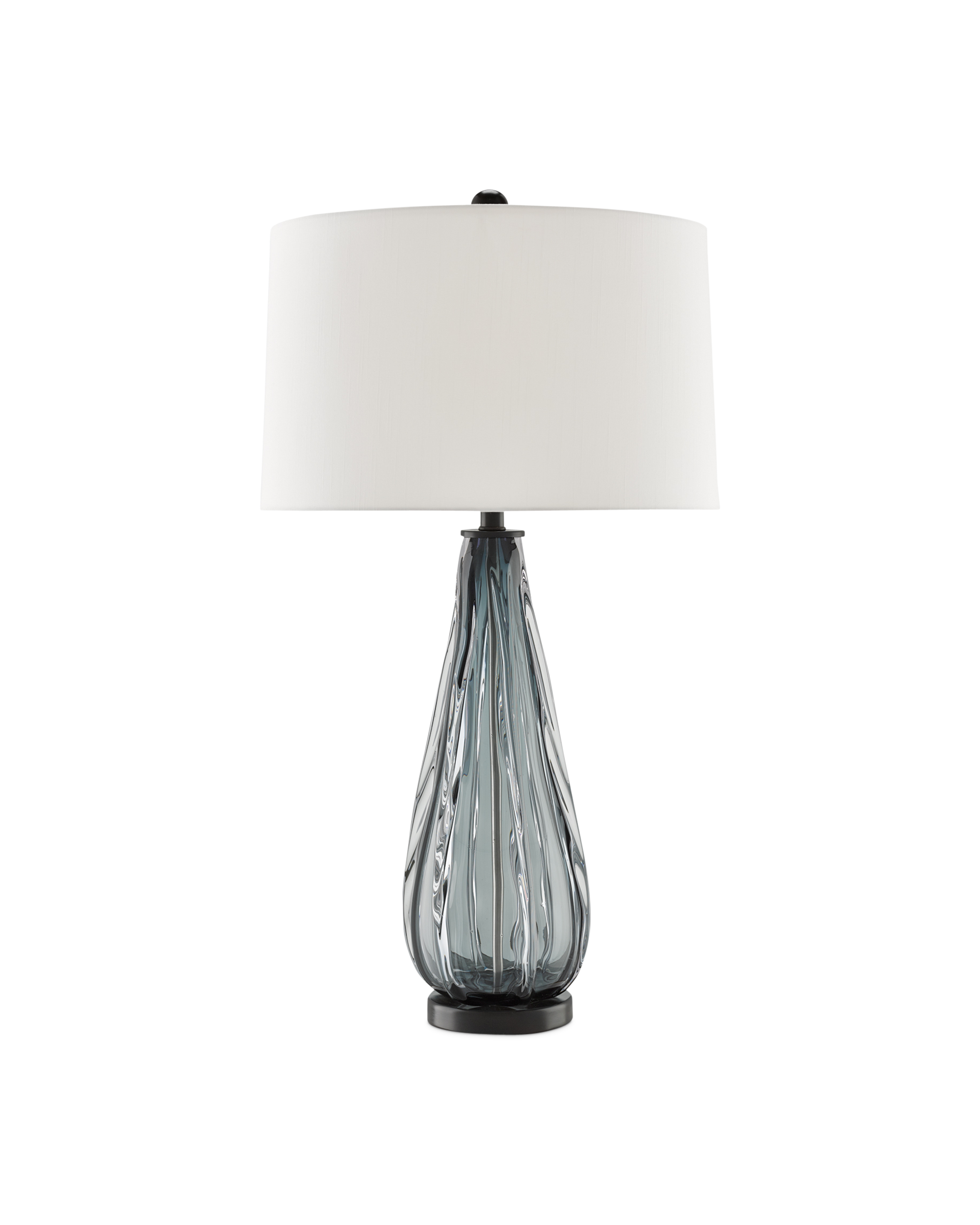 The Nightcap Table Lamp is stylishly stunning with its column of glass that is hand-formed with vertical ribbing on the surface. Complementing the blue-gray blown glass is satin black hardware that brings out the fixture's smoky tones. The blue table lamp is topped with an off-white shantung shade.