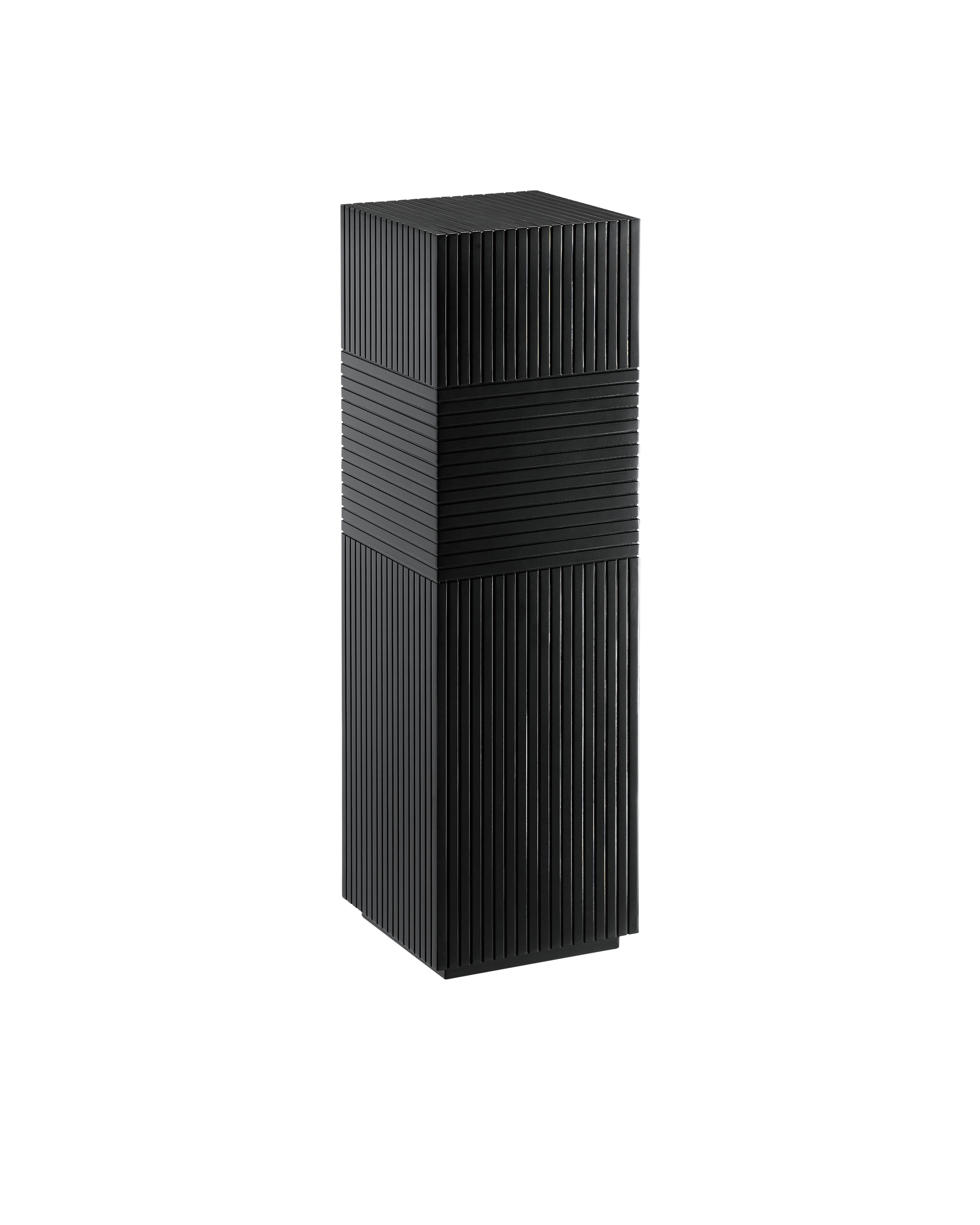 With its handsome black surface marked with parallel striations, the Odense Black Pedestal has several design details to note: the alternating banding that brings an extra hint of texture and the recessed base that gives the pedestal a feeling of lightness.