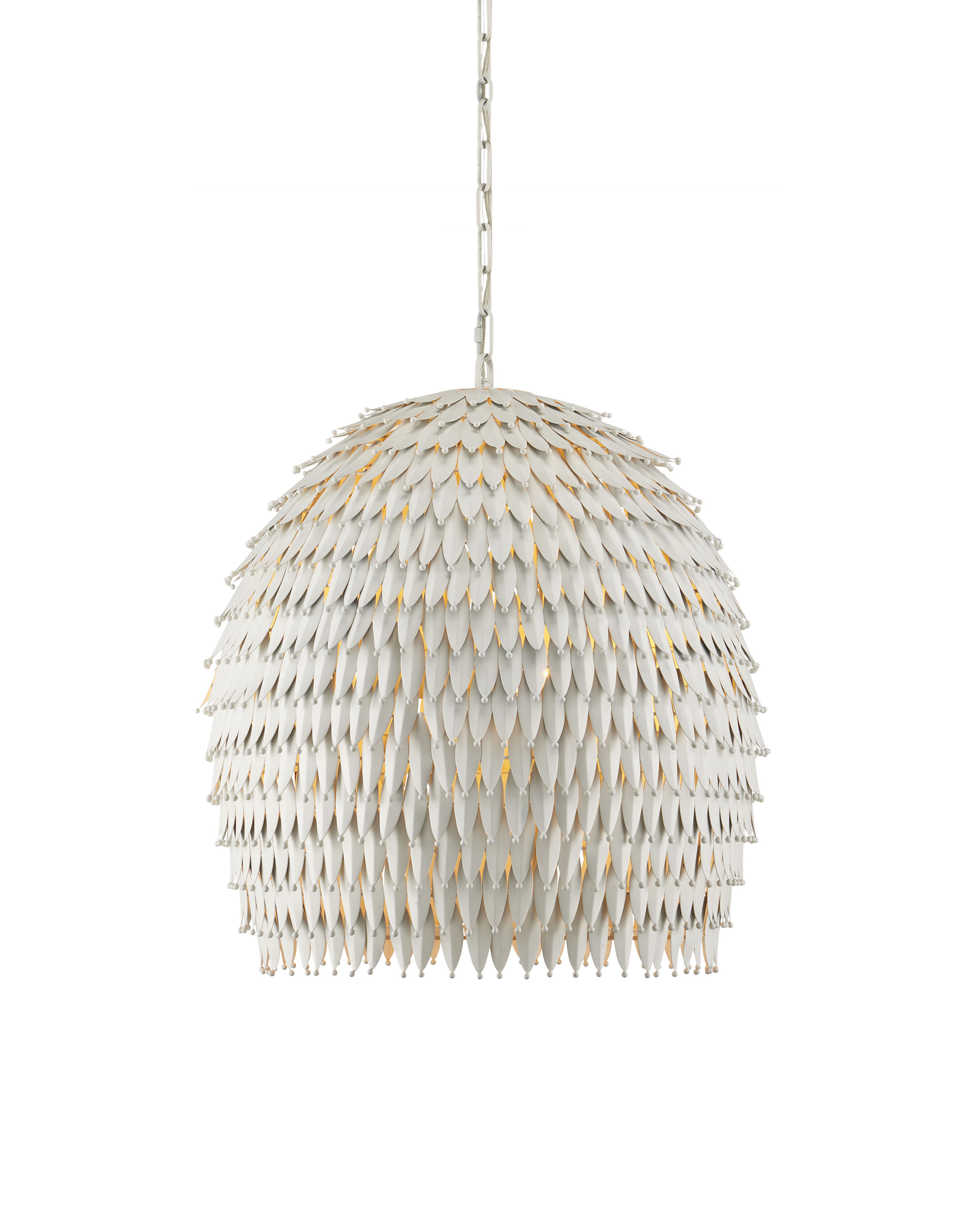 The Overlay Large Pendant is a artisanal creation that is painstakingly made by hand, as each of the leaves are individually cut and welded to the frame and the dots on the edges of the spiky cut-outs are welded on. The elongated-dome shape of the white pendant has a sartorial feel thanks to the textural richness of the fluted edges flowing downward like a couture wedding dress might. Adjustable from 32" to 100" with use of included chain/rod kit/cable. If your space calls for a longer drop, additional chain/rods/cable is available for purchase.