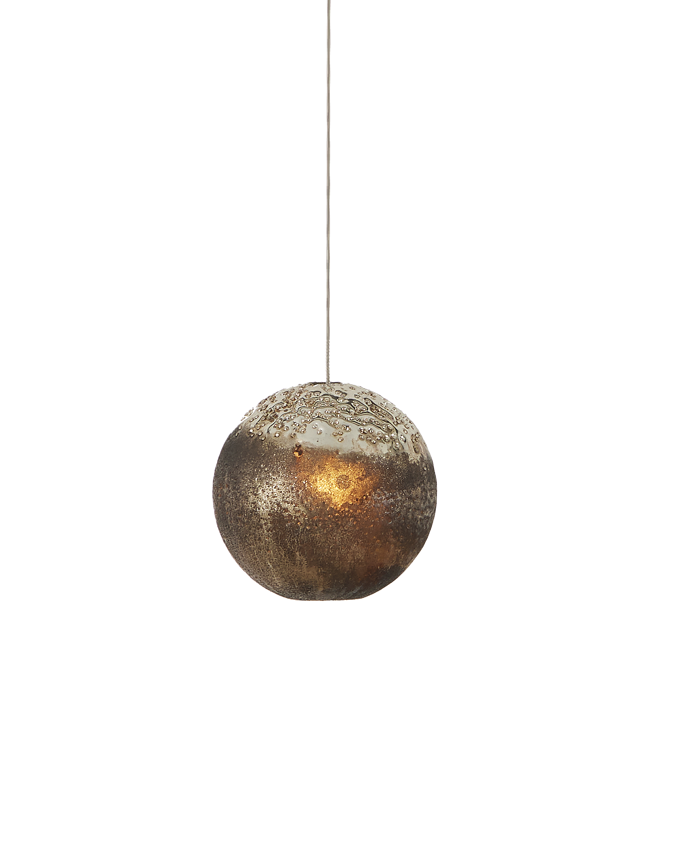 The Pathos 1-Light Multi-Drop Pendant dangles a shade that is a true work of art. The orb has been doused in reactive glazes that make their special qualities known in the antique gold on the top and matte charcoal on the bottom, which will look different when illumination flows through them. The beads on the top were melted into the molten glass just before it cooled to bring even more effervescence the design. This is definitely a fixture for anyone who appreciates individual elements made by hand. The canopy of this piece is luminous in a painted silver finish. This fixture is among Currey & Company's multi-drop pendant collection, which includes multiple configurations.