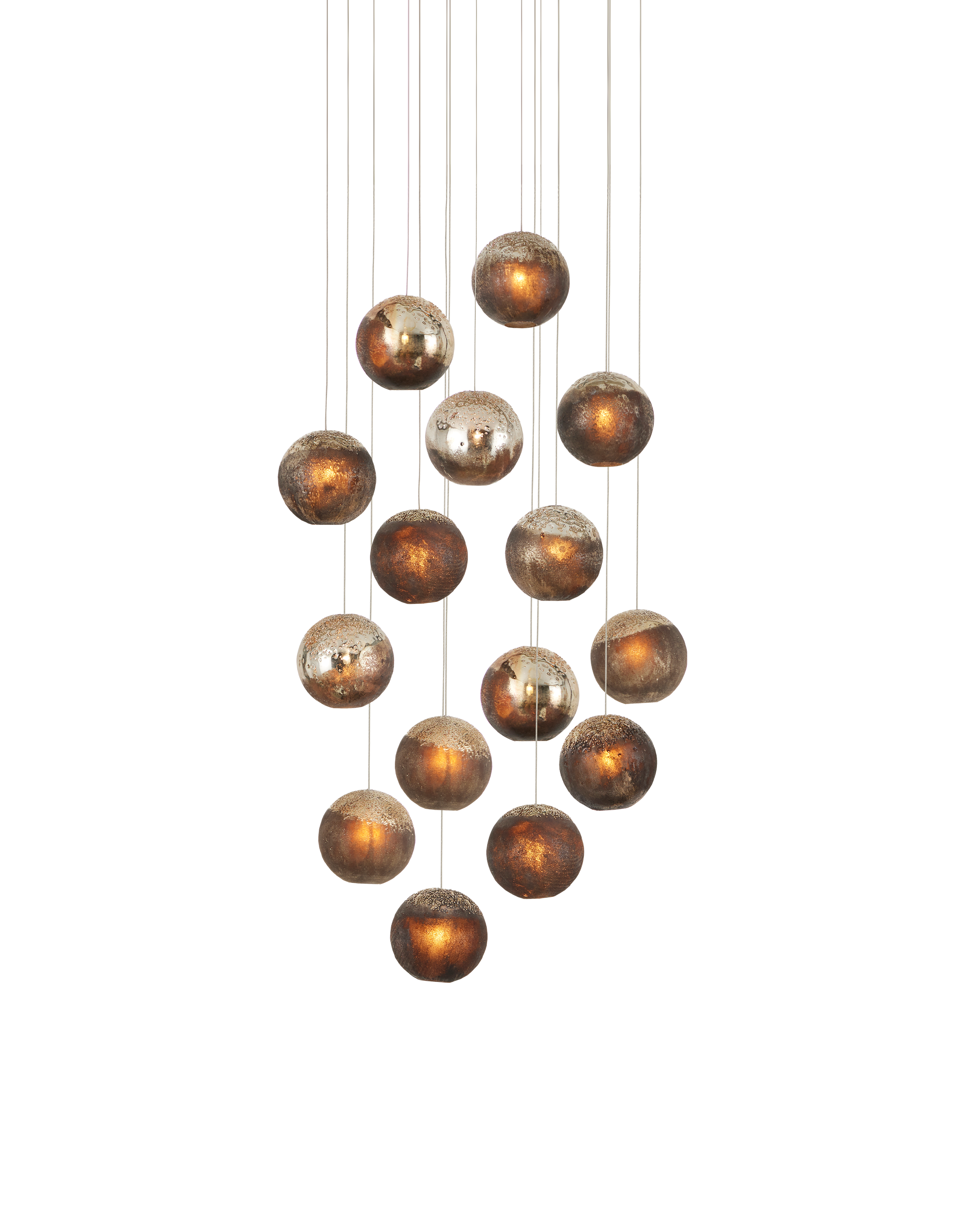 The Pathos Round 15-Light Multi-Drop Pendant dangles shades that are true works of art. The orbs have been doused in reactive glazes that make their special qualities known in the antique gold on the top and matte charcoal on the bottom, which will look different when illumination flows through them. The beads on the top were melted into the molten glass just before it cooled to bring even more effervescence the design. This is definitely a fixture for anyone who appreciates individual elements made by hand. The canopy of this piece is luminous in a painted silver finish. This fixture is among Currey & Company's multi-drop pendant collection, which includes multiple configurations.