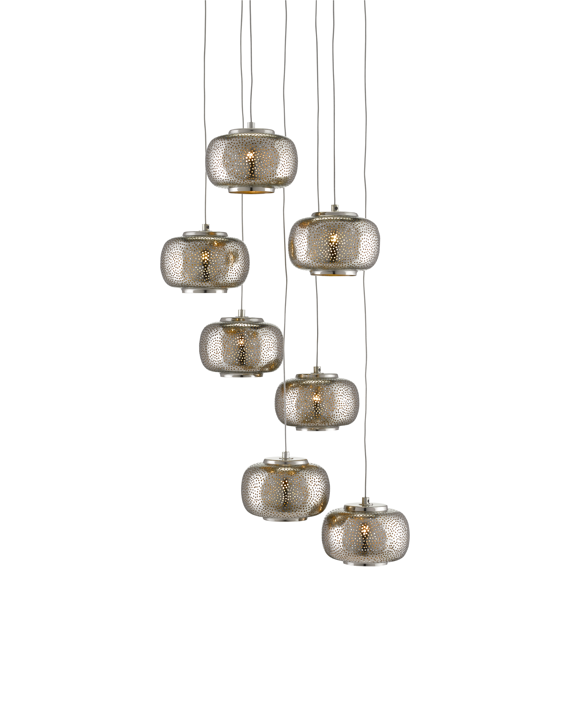 Our Pepper 7-Light Multi-Drop Pendant has pierced metal shades in a mix of painted silver and nickel finishes. The textural metal orbs are on point for modern farmhouse and industrial chic interiors. The canopy of this piece is luminous in a painted silver finish. This fixture is among Currey & Company's multi-drop pendant collection, which includes multiple configurations.