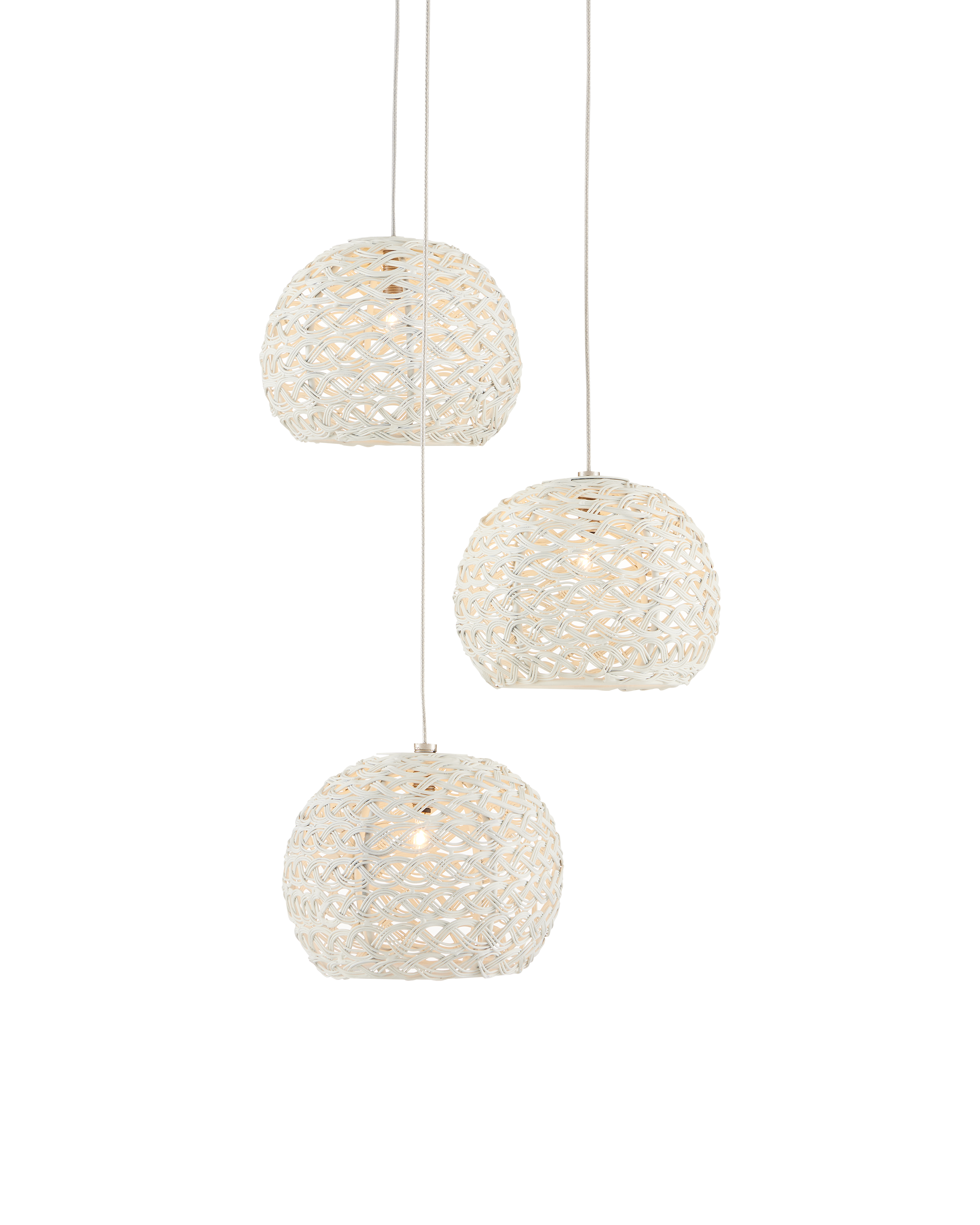 The shades on the Piero 3-Light Multi-Drop Pendant may appear to be woven from a natural plant material, but they are made of iron in a white finish to make it one of our offerings that illustrates the skills our craftspeople bring to their work. When the white pendants are illuminated, textural patterns will enliven surrounding surfaces. The canopy of this piece is luminous in a painted silver finish. This fixture is among Currey & Company's multi-drop pendant collection, which includes multiple configurations.