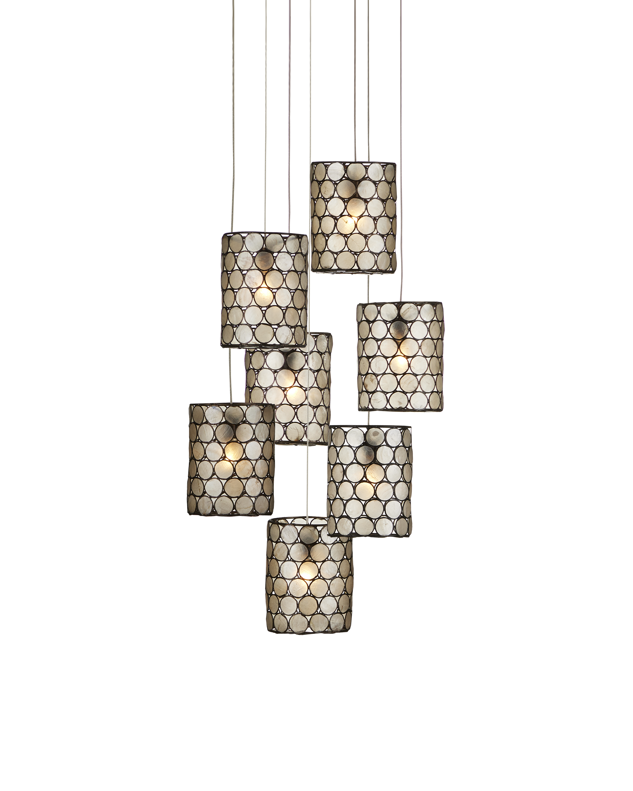 Natural Capiz shell and wrought iron in a Cupertino finish create a luminous circular pattern on the shades of the Regatta Round 7-Light Multi-Drop Pendant. Each cylindrical element has such a pleasing glow when light shines through the lustrous natural material. There is great artistry in achieving such a complex pattern, as each slice of shell has to be surrounded in metal and soldered into a frame once the metal circles are joined to each other. The canopy of this piece is luminous in a painted silver finish. This fixture is among Currey & Company's multi-drop pendant collection, which includes multiple configurations.