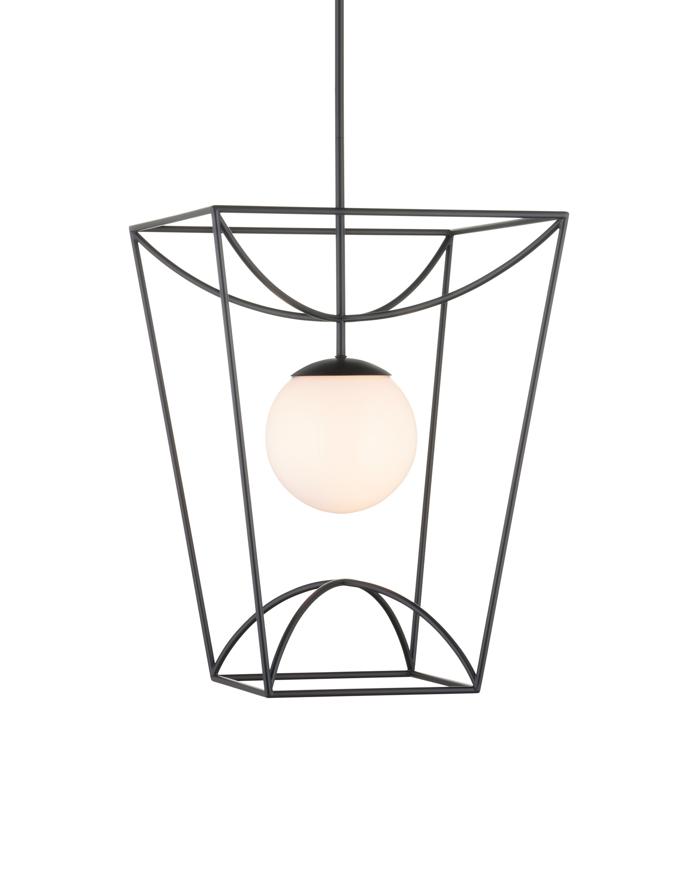The Rochefort Medium Lantern is an outdoor pendant with beautiful lines that subtly draw themselves into a lantern-like form. The black powder-coated finish makes it durable for exterior environments and contrasts the milky white glass globe that it balances in its center. Whereas traditional lanterns may be limited to time-honored and transitional design aesthetics, the delicacy of this black lanterns profile makes it fitting for mid-century modern homes and those that lean contemporary. Adjustable from 29.75" to 71.75" with use of included chain/rod kit/cable. If your space calls for a longer drop, additional chain/rods/cable is available for purchase.
