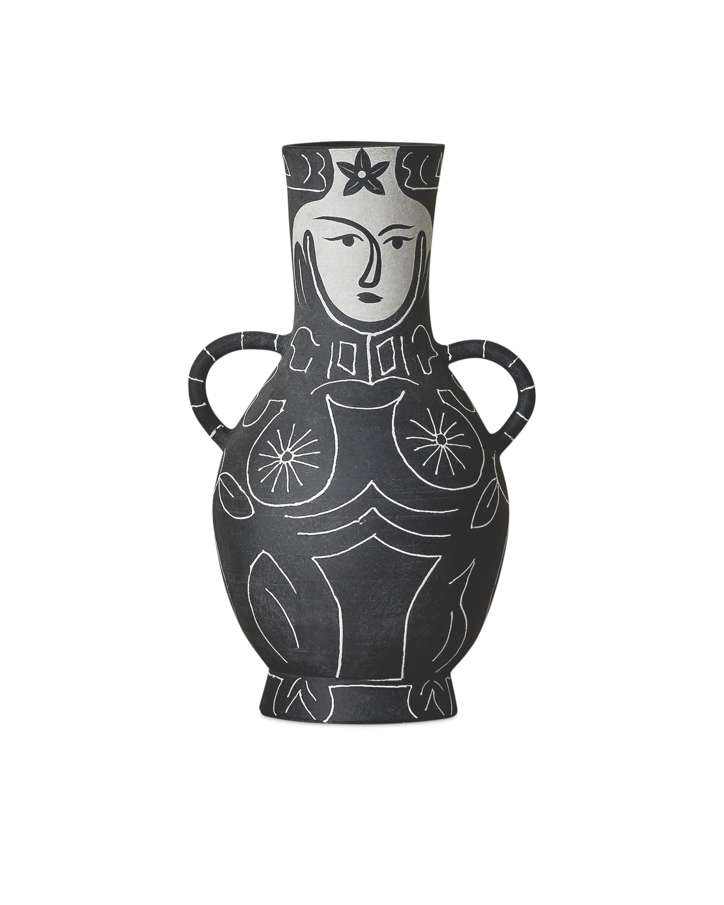 Inspired by the development of 20th-century art pottery during the 1940s, the Saint-Paul-de-Vence Large Vase is a nod to the great design experimentation going on at the time. This interpretation of that burgeoning creativity is made of terracotta that has been glazed in a matte black, over which the whimsical figure has been hand-painted in white.