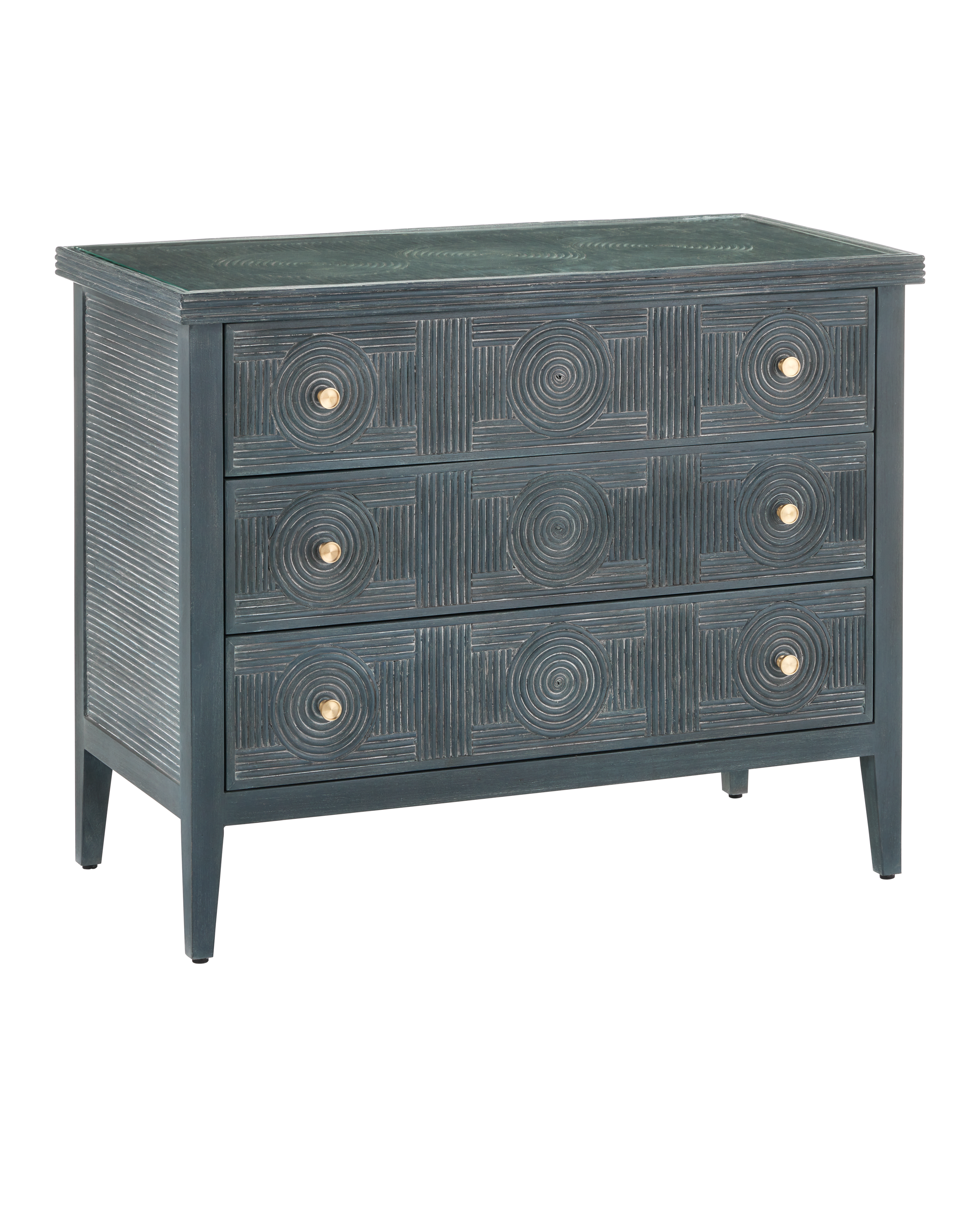 The Santos Vintage Navy Large Chest has a split rattan pattern on the drawers, sides, and top, which is made by hand and applied to a solid mahogany frame before the entire piece is covered in a vintage navy finish. A design detail of note is how the brass pulls in a brushed brass finish sit squarely in the center of the circles created by the pattern. This navy blue chest has solid mahogany dovetail drawer boxes, soft-close drawer slides, and adjustable glides.