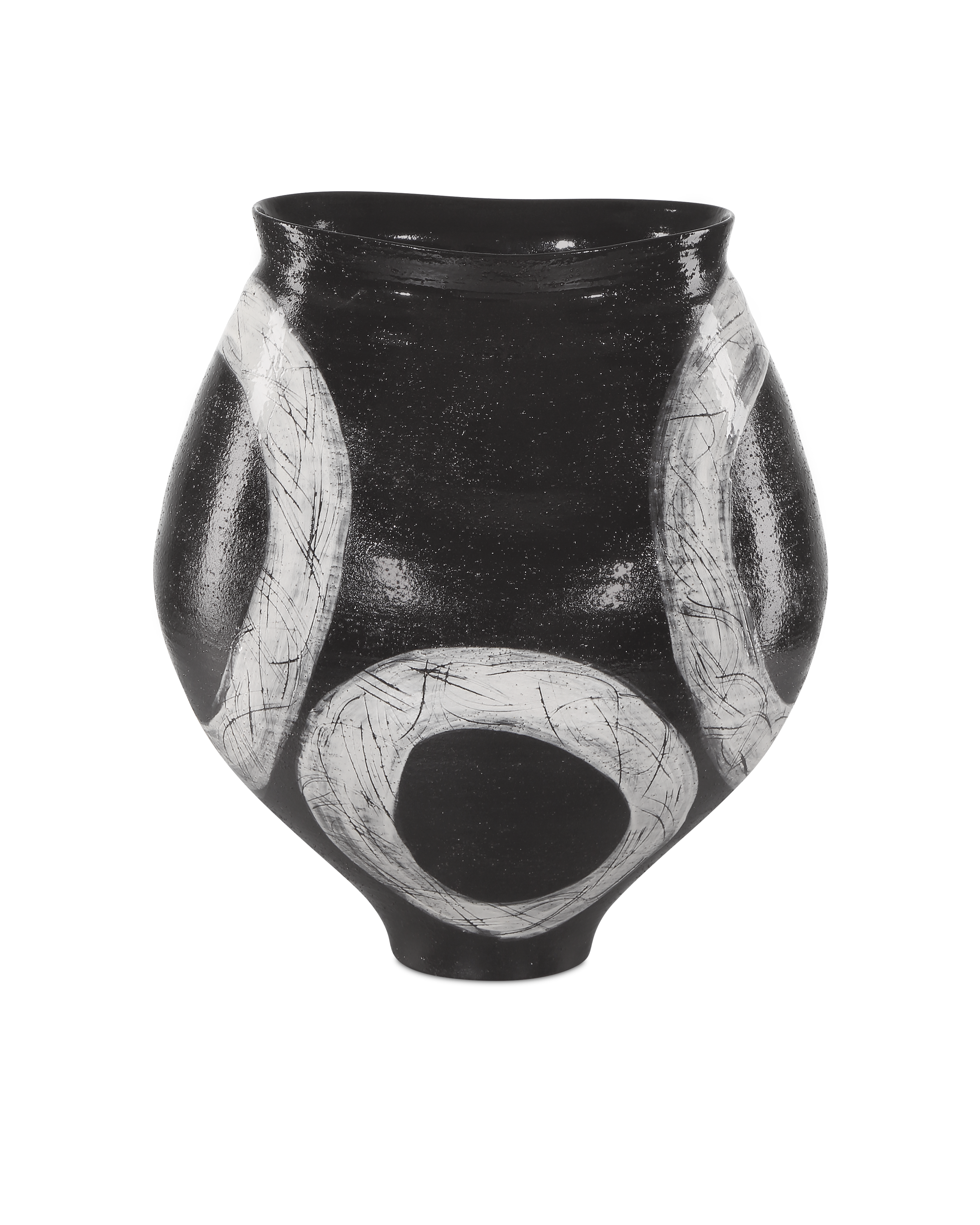 The Satori Vase is an artisanal creation made of porcelain that is hand-thrown, hand-glazed, and hand-decorated. The pale gray and black vessel has intentional pitting on the surface. Because the motifs on this vase are created by hand, each will vary slightly as each artist puts his brush to the surface of the glazed material in his or her own unique way. A design detail worth noting is how the vase sits on a smaller rounded bottom, while the irregular oval top reflects the swell of the vessel's shape.