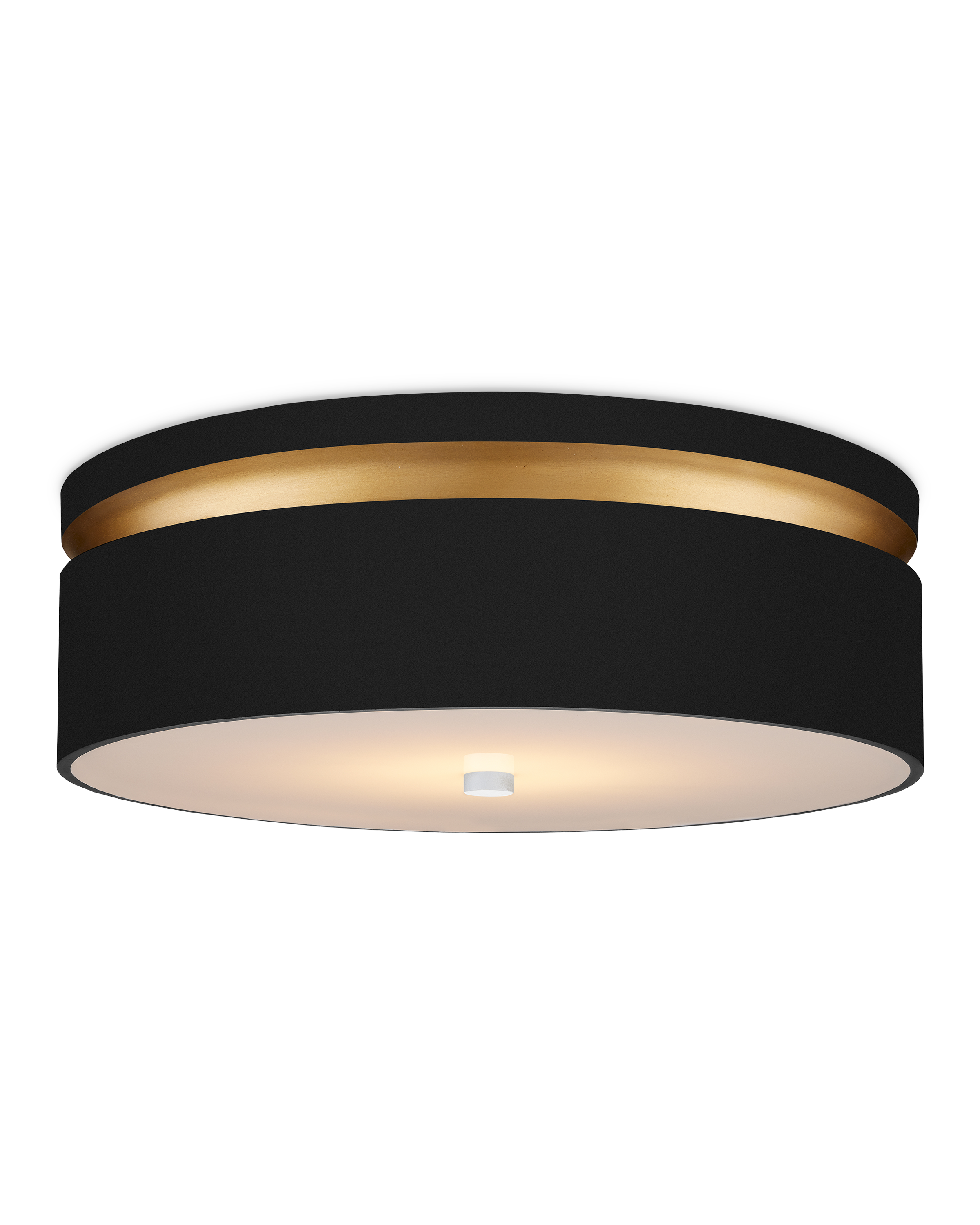 Clarence Mallari designed the chic Serenity Flush Mount with its intermingling of dark, light, and bright tones. Made of metal, the outer perimeter is richly hued in a mix of satin black and painted contemporary gold finishes. The acrylic diffuser is fitted to the black ceiling light with a minimal finial in a sugar white finish. A design detail of note is how the integrated LED light wafts through the shade to illuminate the gold band.