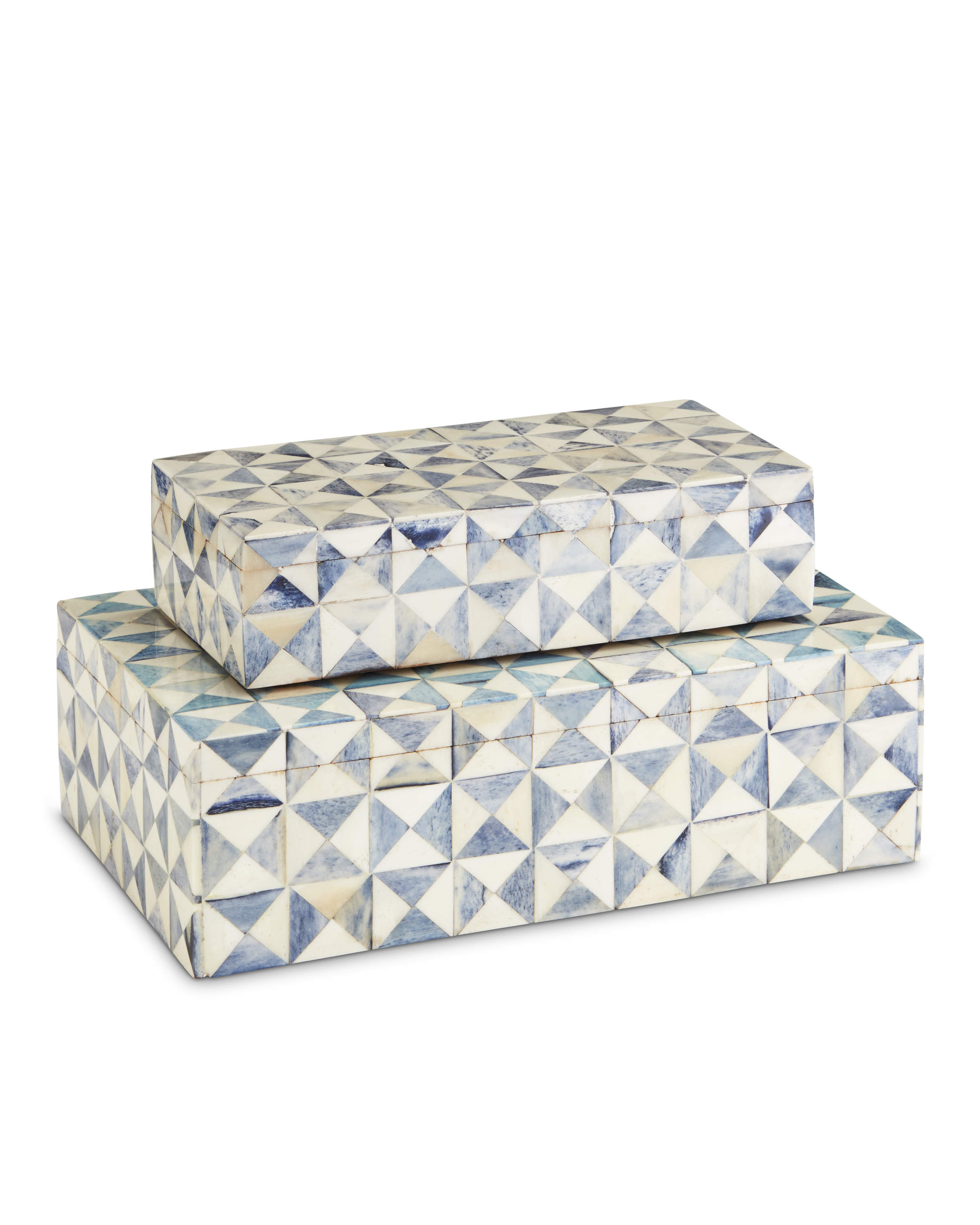 The Sky Blue Box Set illustrates the talents of the artisans who create the surfaces of these white decorative boxes. The mosaics in white and blue bone are painstakingly arranged and affixed to the wood boxes. The patterns achieved by the triangular shaped segments bring this white decorative box a textural feel while the patina washed on top gives it an aged appeal.