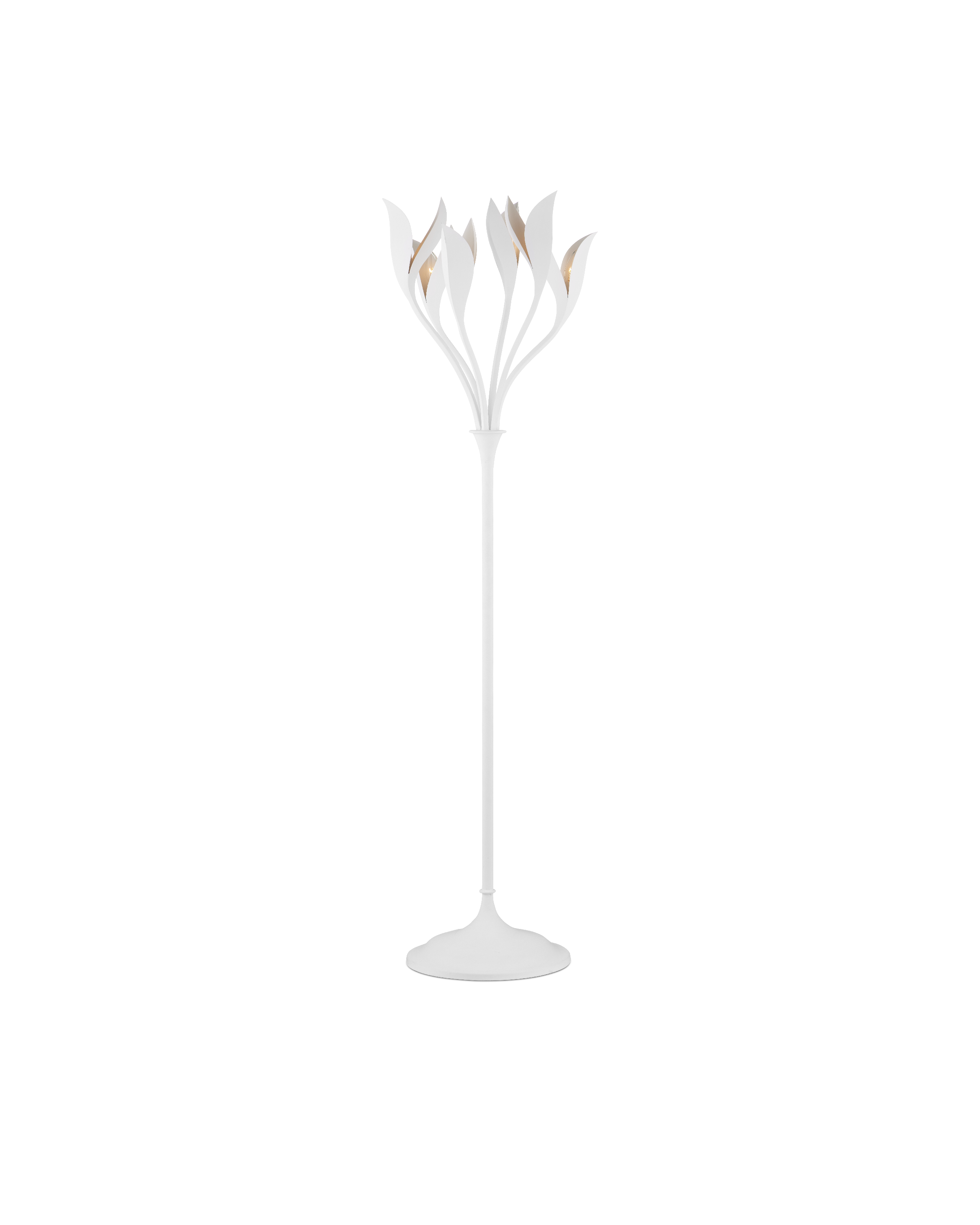 The big, beautiful blossoms of the Snowflower Floor Lamp and the body they flow up from are made of wrought iron in a gesso white finish. Unfolding toward the ceiling, the undulant petals direct the light upward. The pale finish that flows into the interiors of the blooms turns warm when the bulbs illuminate it. The white floor lamp with its wild botanical personality has a foot switch for ease of turning it off and on.