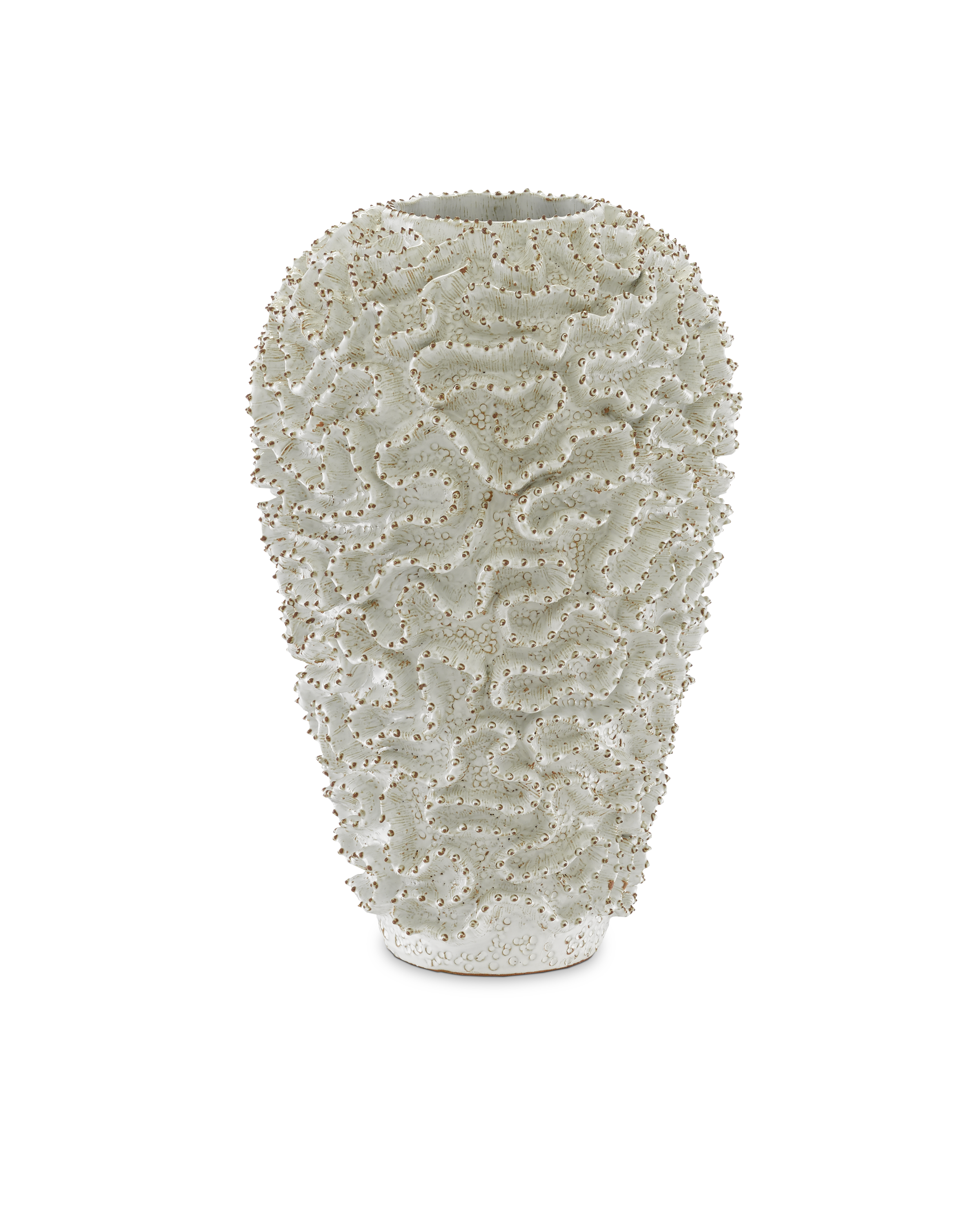 Our Swirl Large White Vase is made by a group of women who live at the border of Burma and Thailand. They reproduce this shape to mimic the intricate cactus plant using black terracotta. The result is very interesting, as it certainly has the feel of a cactus vase but it is just as easily an Art Deco design.