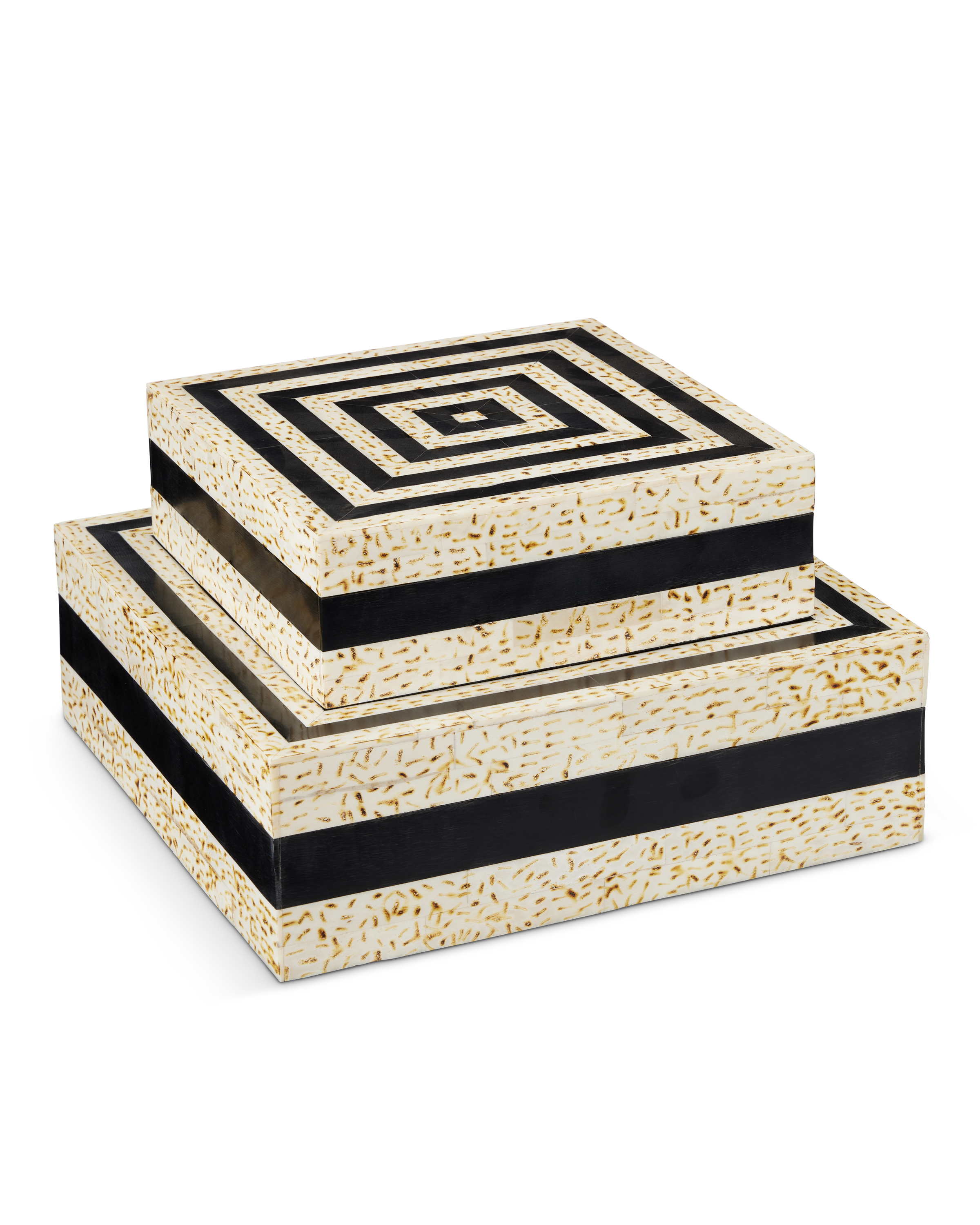 The Taurus Box Set has a number of artisanal aspects to its design and construction. One of which is how the handmade ivory and black decorative boxes have mitered corners that follow the line telescoping from their tops to their bottoms. Once the bone and composite materials have been fitted together in tidy lines, texture is achieved on the surface when artisans mark the white speckled bone with a brazing tool. This level of specificity and the fact that the boxes are composed like intricate puzzles illustrate Aimee Kurzner's ability to bring complexity to artisanal accessories.