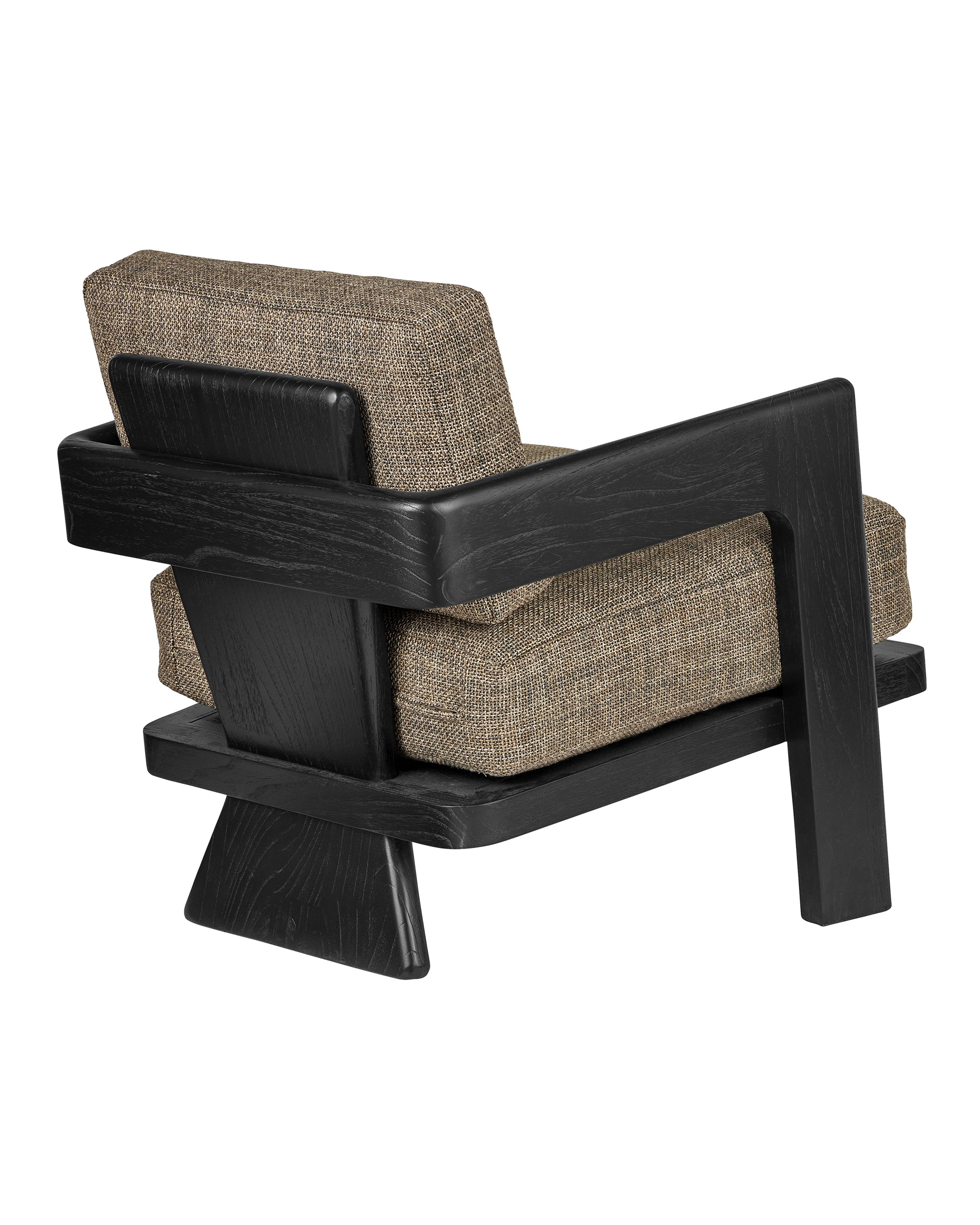 The Theo Lounge Chair, covered in Rig Otter fabric, has a solid Mindi wood frame in a caviar black finish. The upholstery fabric on this piece packs a punch with its textural weave and serves as a light contrast to the dark wood. The back leg on the roomy chair splays backwards to create an interesting profile. The deep tones in the wood draw out the darker tones in the nubby fabric.