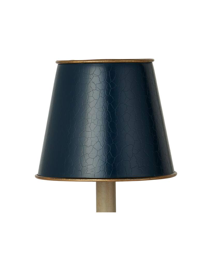 Petite shades are an easy way to bring added style and refinement to a space. The Tole Blue Tapered Chandelier Shade is made of metal in a navy finish with raised rims of gold detailing at the top and bottom of the shade, which is fitted with a candle clip. The finish has a subtle crackle effect that will add a classic patina to any fixture.
