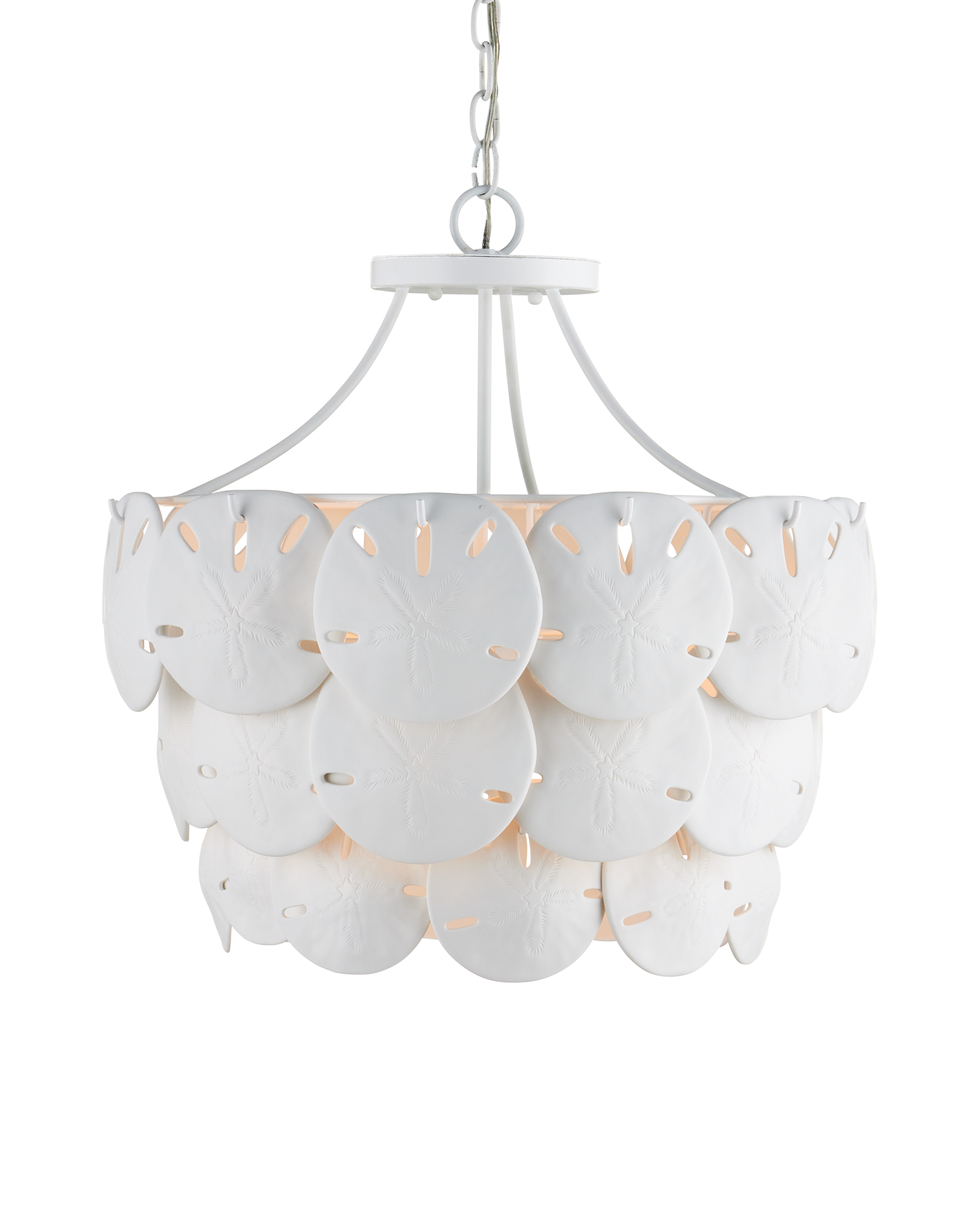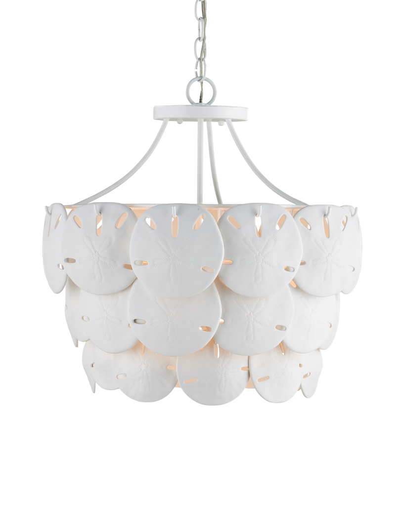 Marjorie Skouras designed the Tulum Medium Chandelier, inspired by the tropical beauty of the Yucatan Peninsula where she lives. This is an elegantly delicate design, as the sand dollars are cast in semi-translucent bone china and they make a pretty sound when a strong breeze ruffles them. There are three sizes of removable sand dollars on this design, which makes it easy to clean. The sugar white finish on the hardware complements the pale discs on this nature-inspired chandelier, making it apropos for rooms overlooking the ocean. Adjustable from 18.75" to 95.25" with use of included chain/rod kit/cable. If your space calls for a longer drop, additional chain/rods/cable is available for purchase.