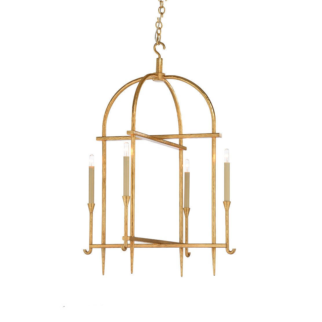 Diego lantern is a simply elegant chandelier with a hammered gold leaf finish that will elevate any design. The transitional open frame design features four electrified candles that allow perfect accent lighting to shine throughout hallways, stairways, foyers, kitchen and dining areas.