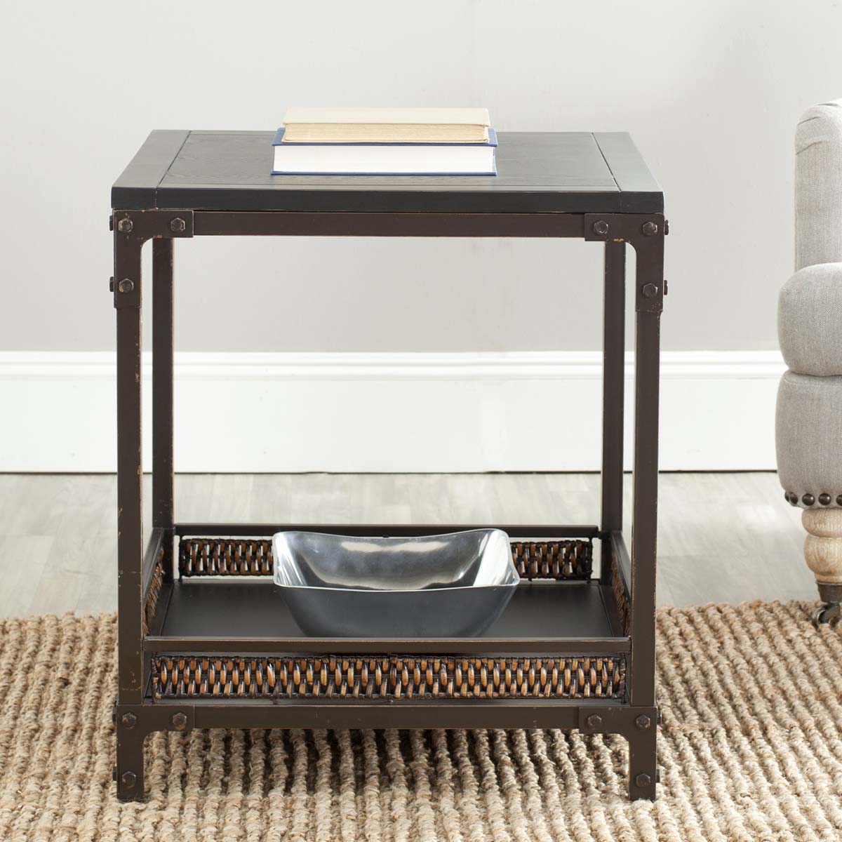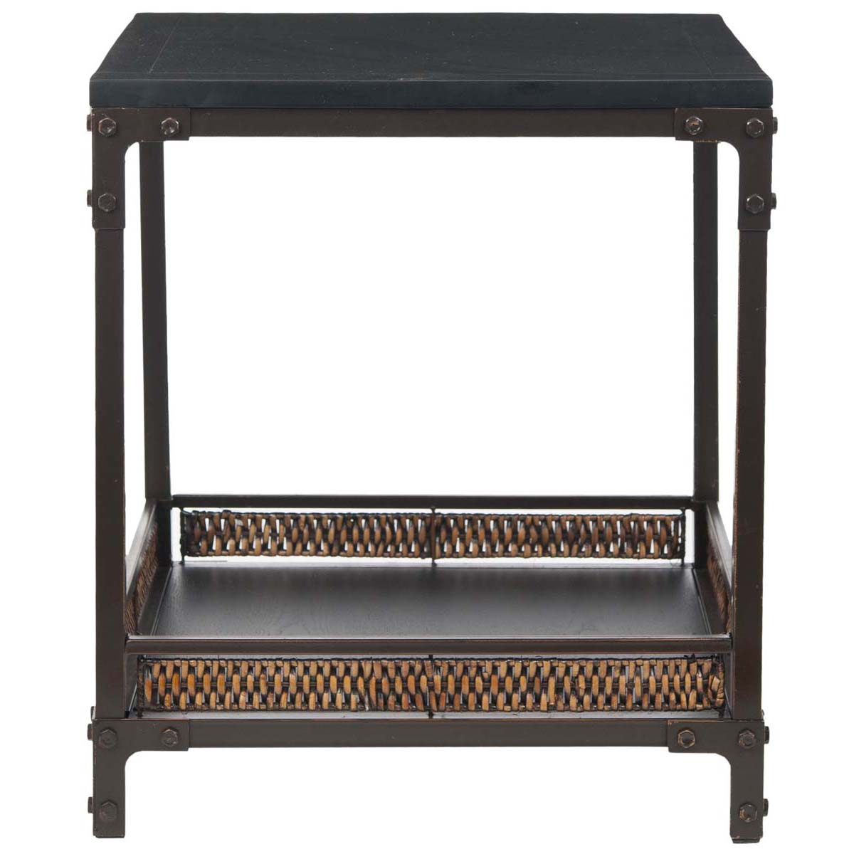 The Dinesh End Table pairs casual style with industrial undertones. A black wood top and wicker bottom shelf stand atop dark walnut toned metal legs which boast exposed rivets and brackets??a modern counterpoint to the traditional inspiration. Minor assembly required.