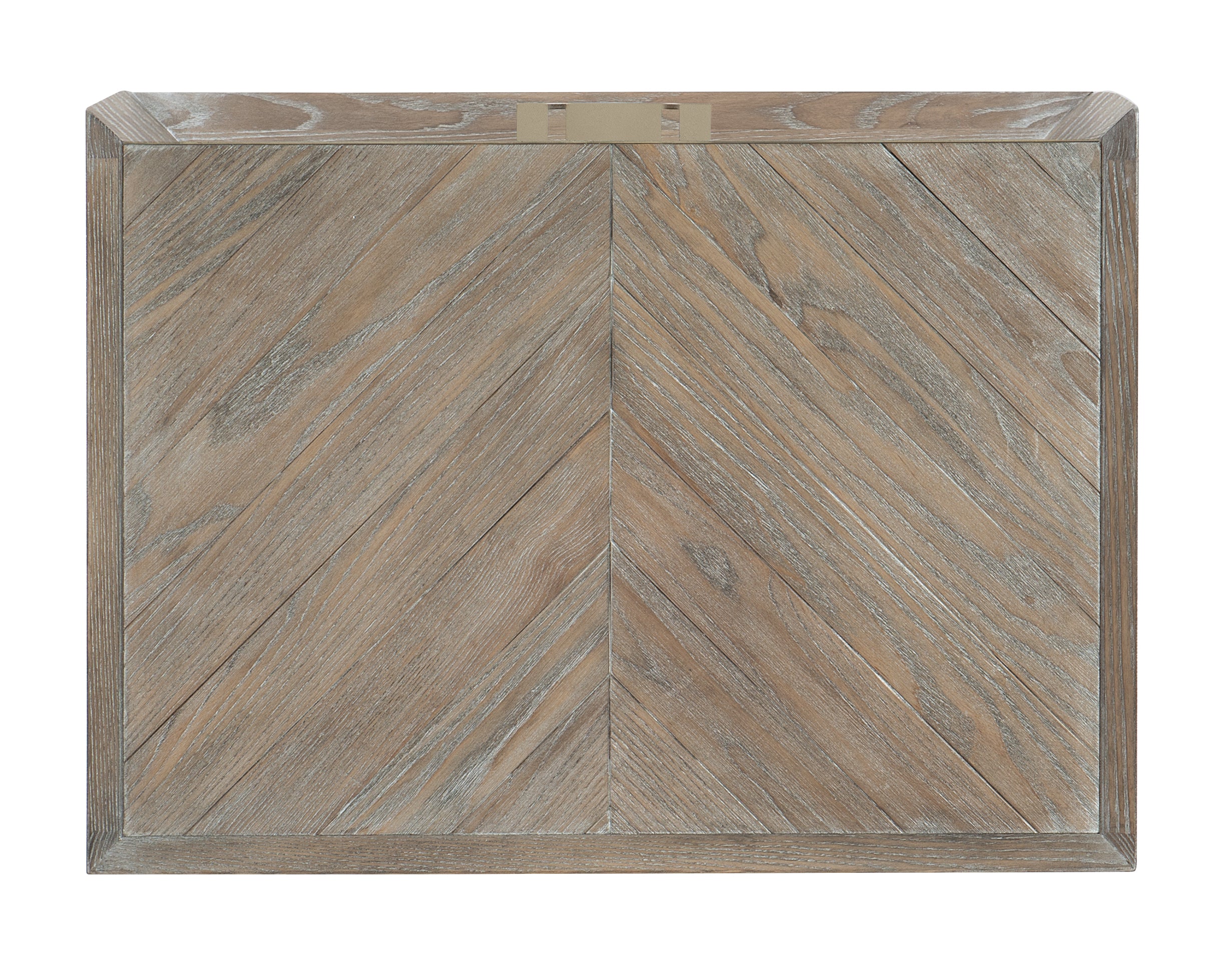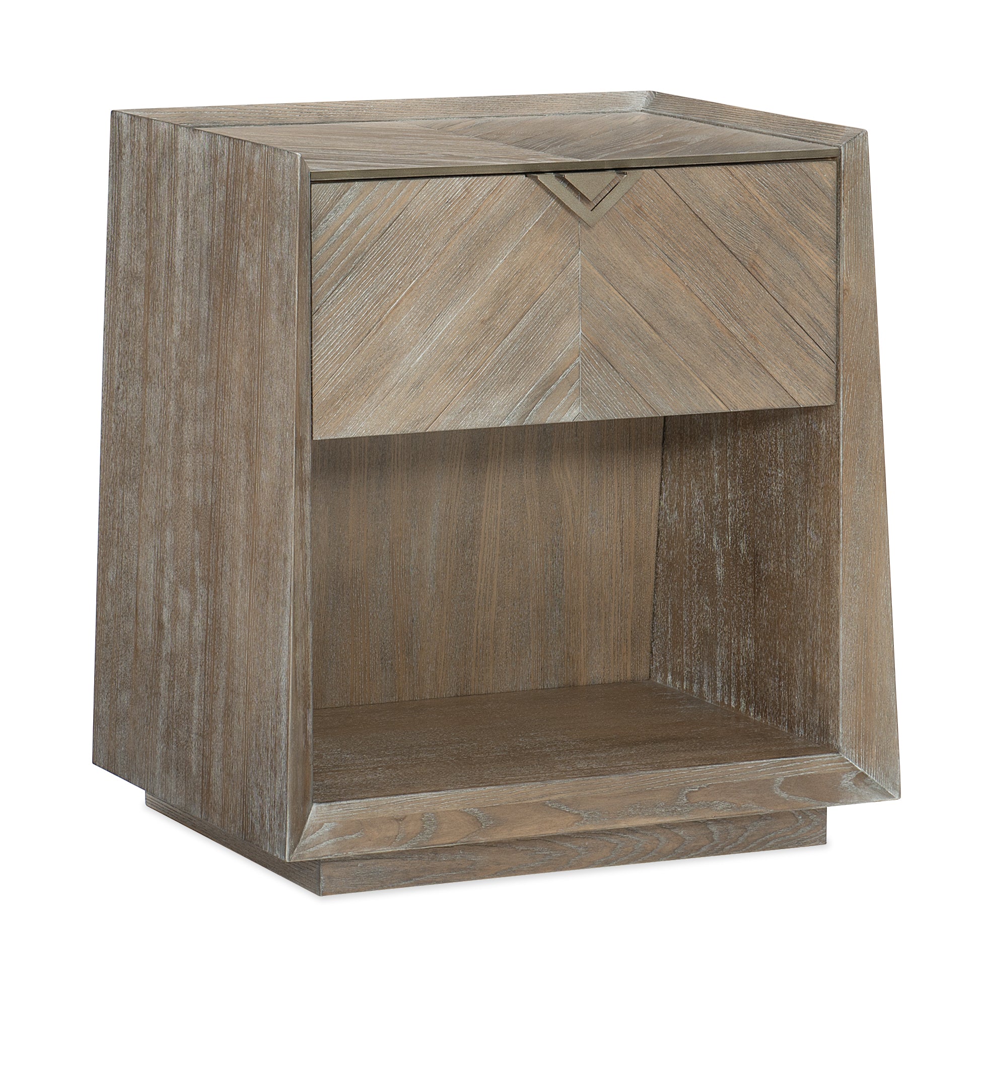 Say goodnight in style with this beautiful nightstand. It boasts a simple, slightly tapered silhouette brought to life with exquisitely matched directional woodgrain veneers in a one-of-a-kind chevron pattern. A casual yet elegant finish of Ash Driftwood highlights the beauty of its stunning veneers and a bead of Sundance Gold gives the top edge a touch of luxe. This nightstands one drawer is fully finished in an elegant shade of Putty while an open lower shelf is perfect for keeping a few of your favorite things close at hand.