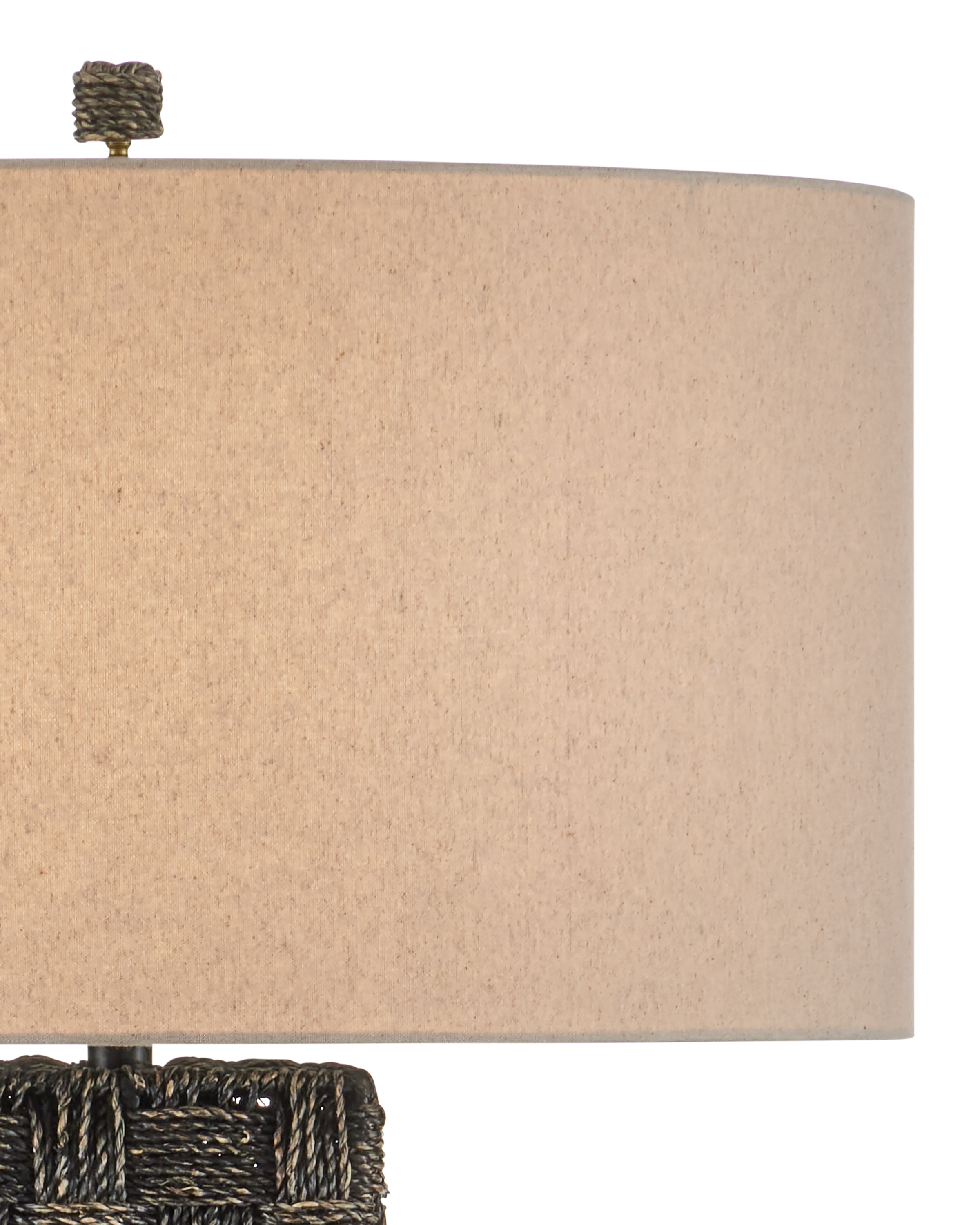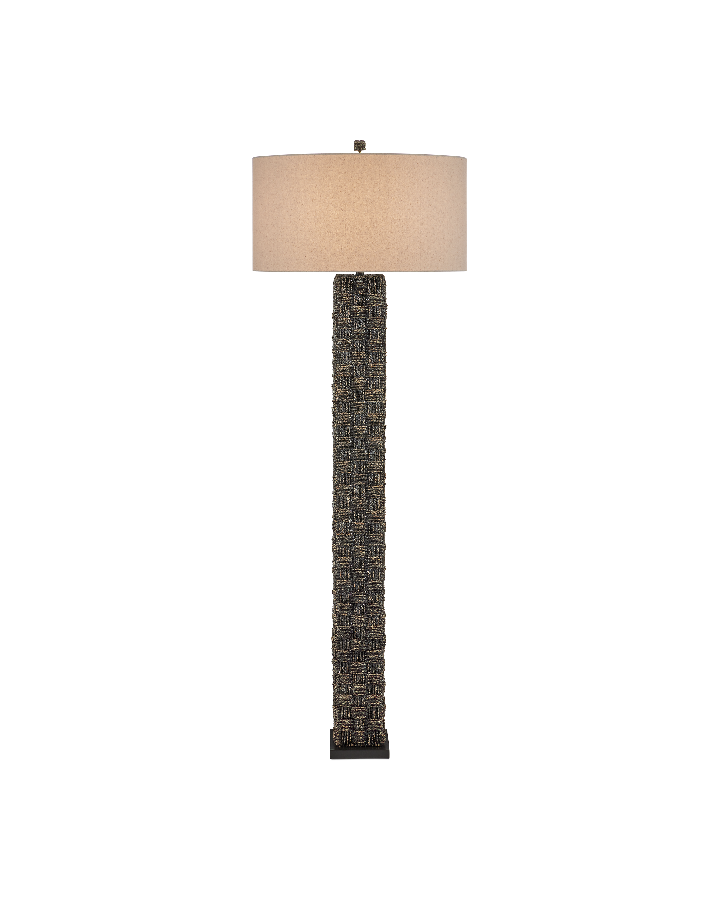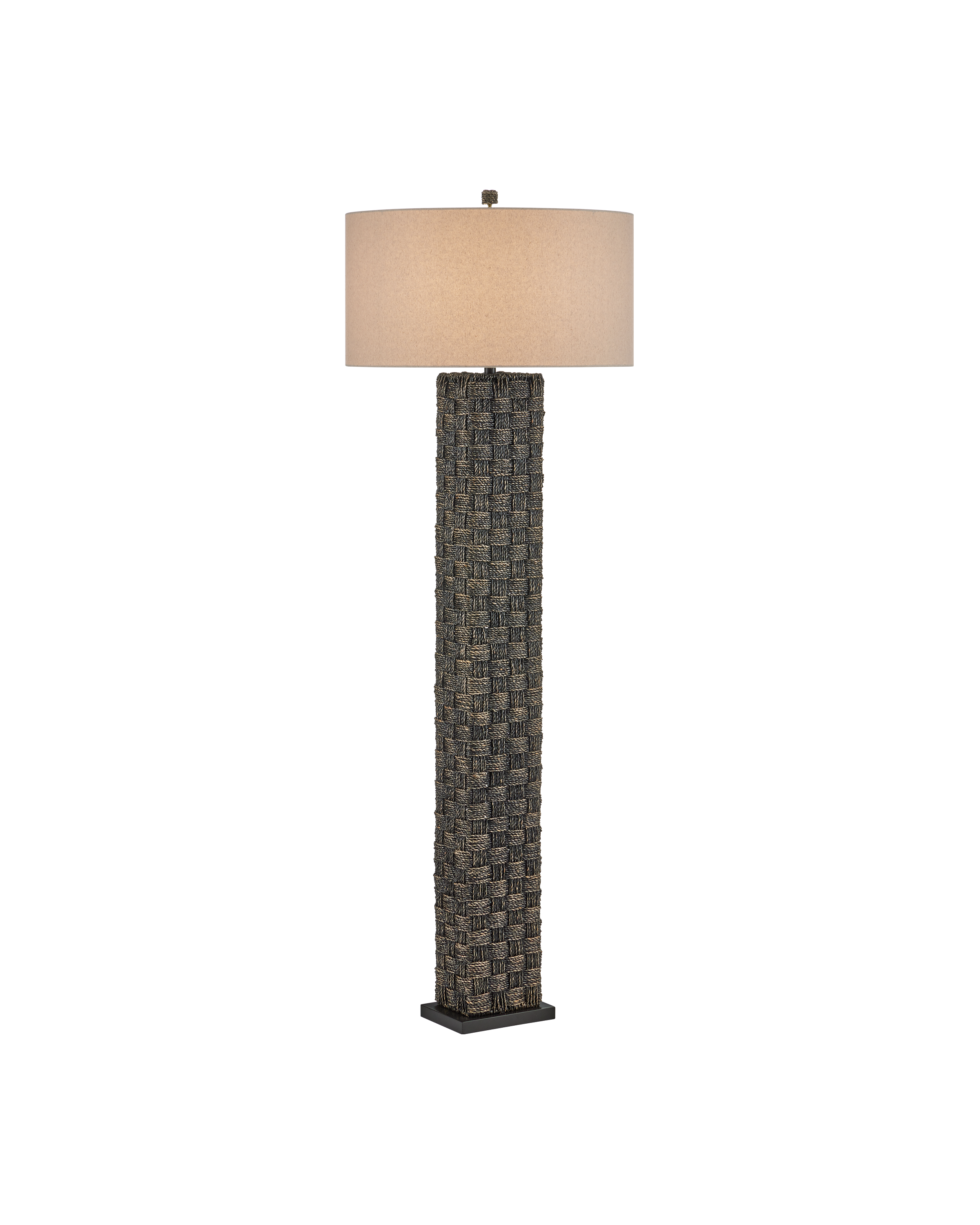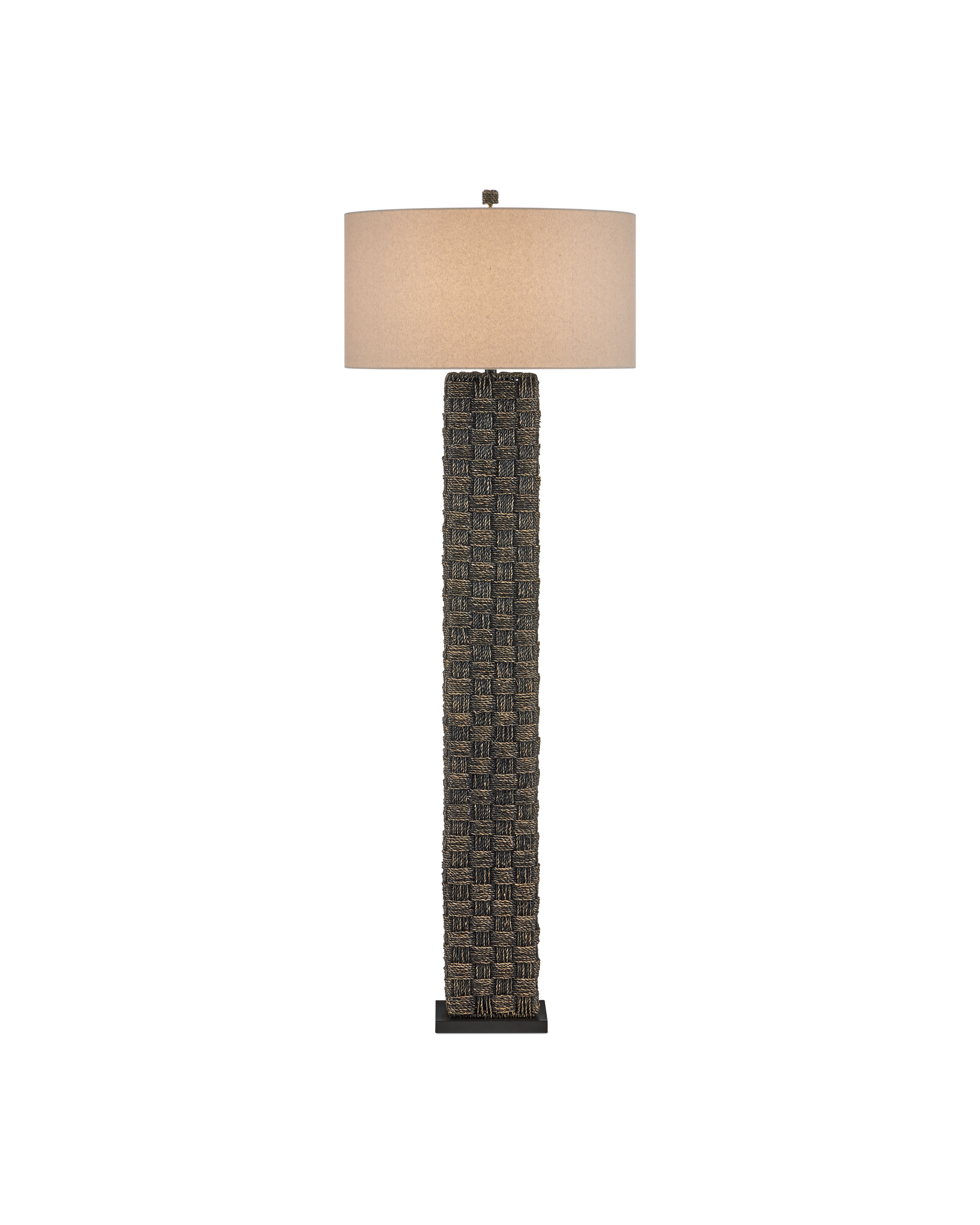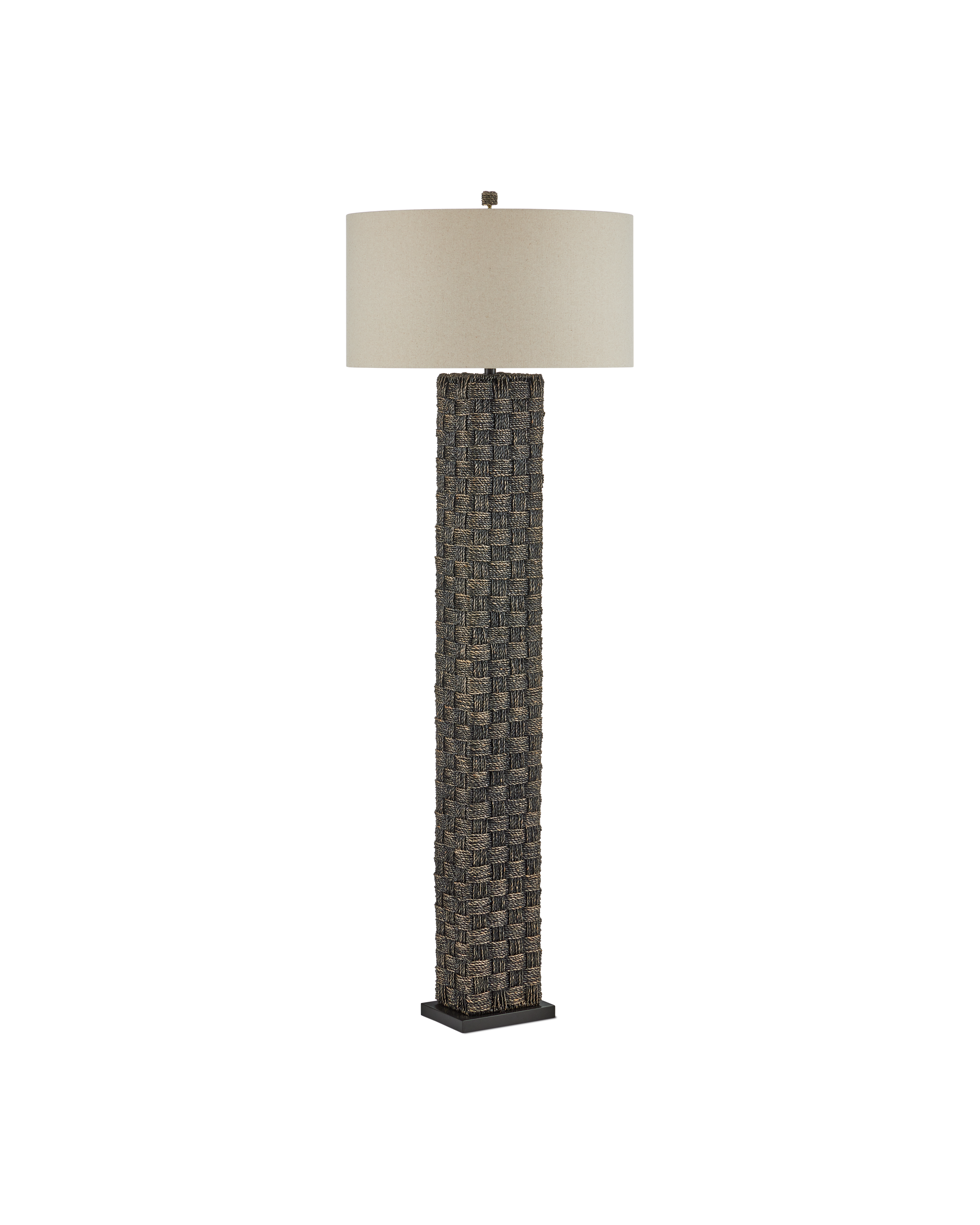 The Eden Floor Lamp features a tall rectangular column crafted from seagrass that has been hand-twisted, painted black, and intricately woven into a gingham pattern by skilled artisans. The richly textured surface rises from a simple black-painted wood base. A linen drum shade softens the look and highlights the lighter tones in the natural fibers, while a coordinating finial wrapped in matching seagrass completes the design with thoughtful detail.