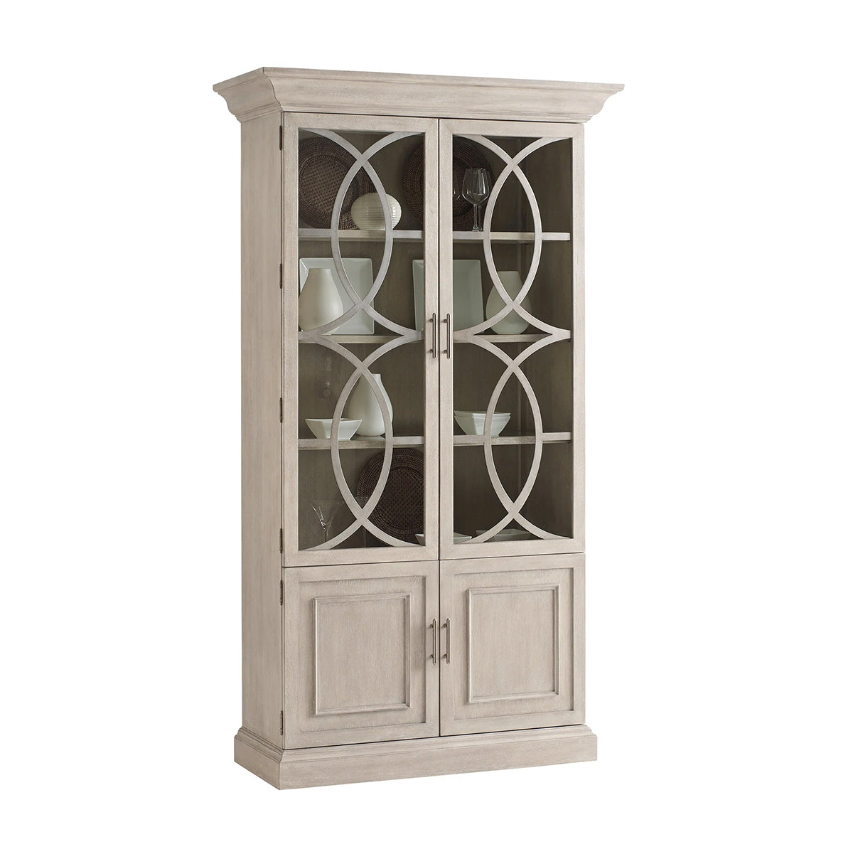 The El Matador curio features an elegant concentric circle design of metal fretwork on the glass doors, three wood-framed adjustable glass shelves and LED touch lighting. Behind each of the doors at the bottom is one adjustable storage shelf. Upper section: 2 wood framed glass doors with metal concentric circle fretwork in a burnished sauternes coloration. 3 wood framed adjustable glass shelves, LED touch lighting, cord management.